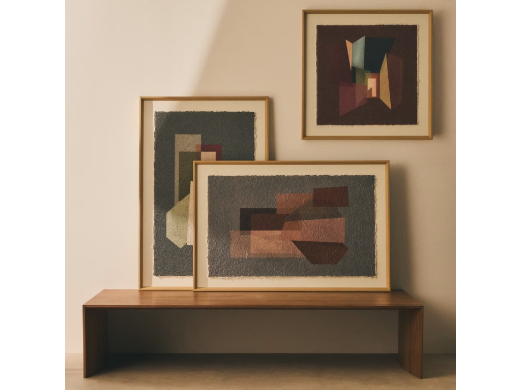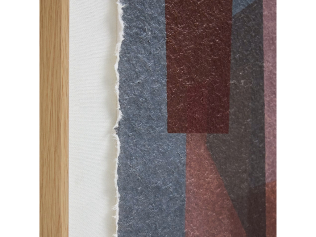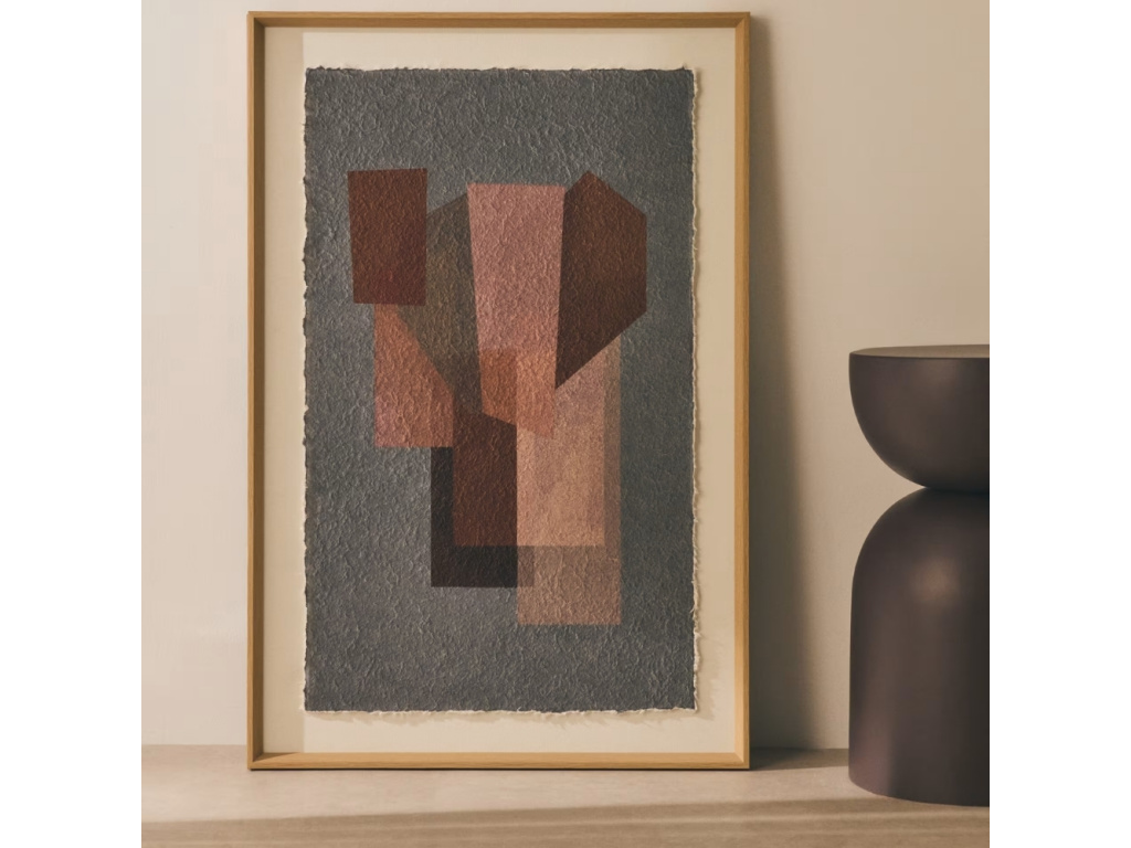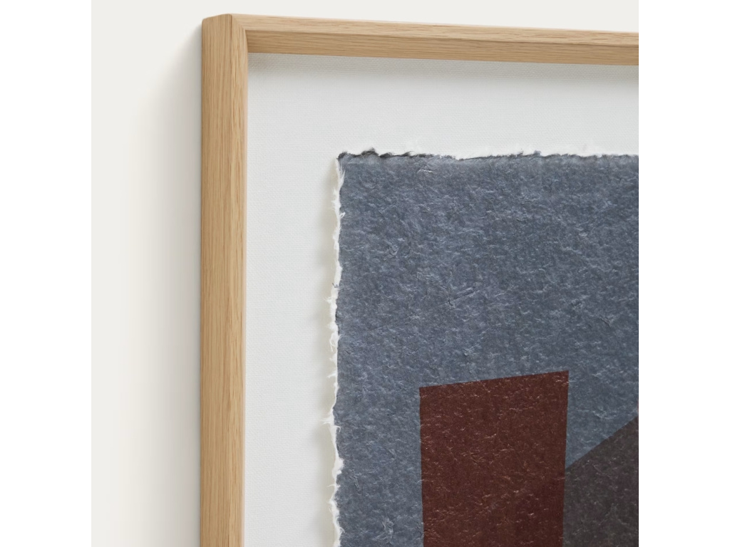 Série abstraktních obrazů Veluni představuje současnou interpretaci kubistického jazyka, která propojuje geometrii, barvy a architektonickou inspiraci poloviny 20. století. Na recyklovaném papíře vzniká kompozice plná textury a hloubky, kde se překrývají tvary a vrstvy, aby vytvořily dynamický vizuální efekt. Kombinace šedých, vínových i neutrálních tónů působí vyváženě a dodává prostoru charakter i eleganci. Čistý rám s jemnými liniemi podtrhuje moderní vzhled a umožňuje obrazu snadno zapadnout do různých interiérů – od obývacího pokoje přes ložnici až po pracovní kout.
