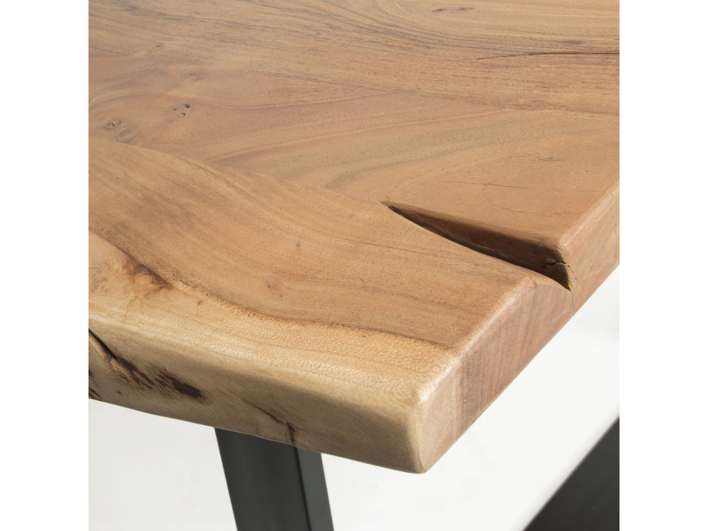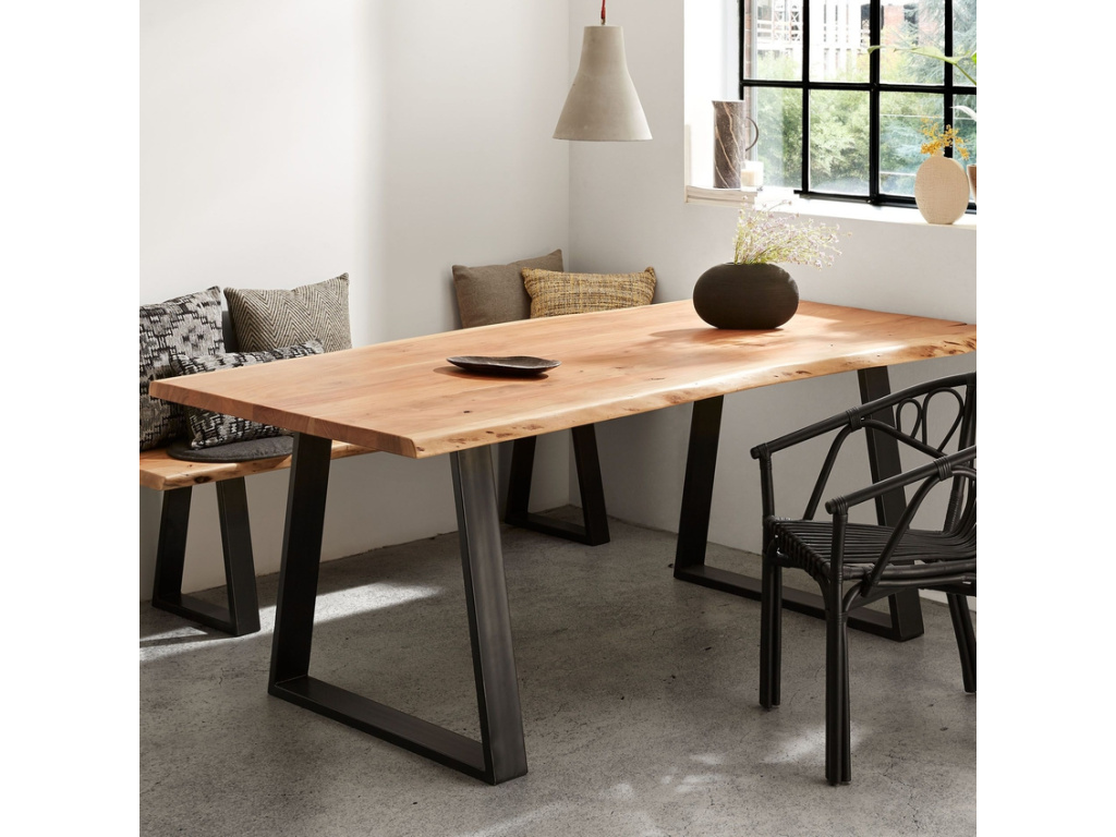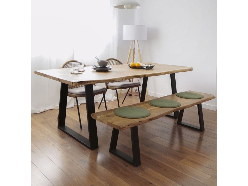 Stylový jídelní stůl Alaia s masivní akátovou deskou a kovovou podnoží zaujme zejména ty, kteří milují kvalitní materiály a jejich moderní až nadčasové propojení. Přírodní deska ve spojení s černě lakovaným kovem vytváří dokonalou kombinaci, která do vašeho interiéru vnese industriální i rustikální nádech. Kolem stolu se pohodlně usadí osm stolovníků. Každý kus je jedinečný díky unikátním tvarům a tónům masivního dřeva, které navíc pochází z udržitelně obhospodařovaných lesů s kontrolovaným kácením.