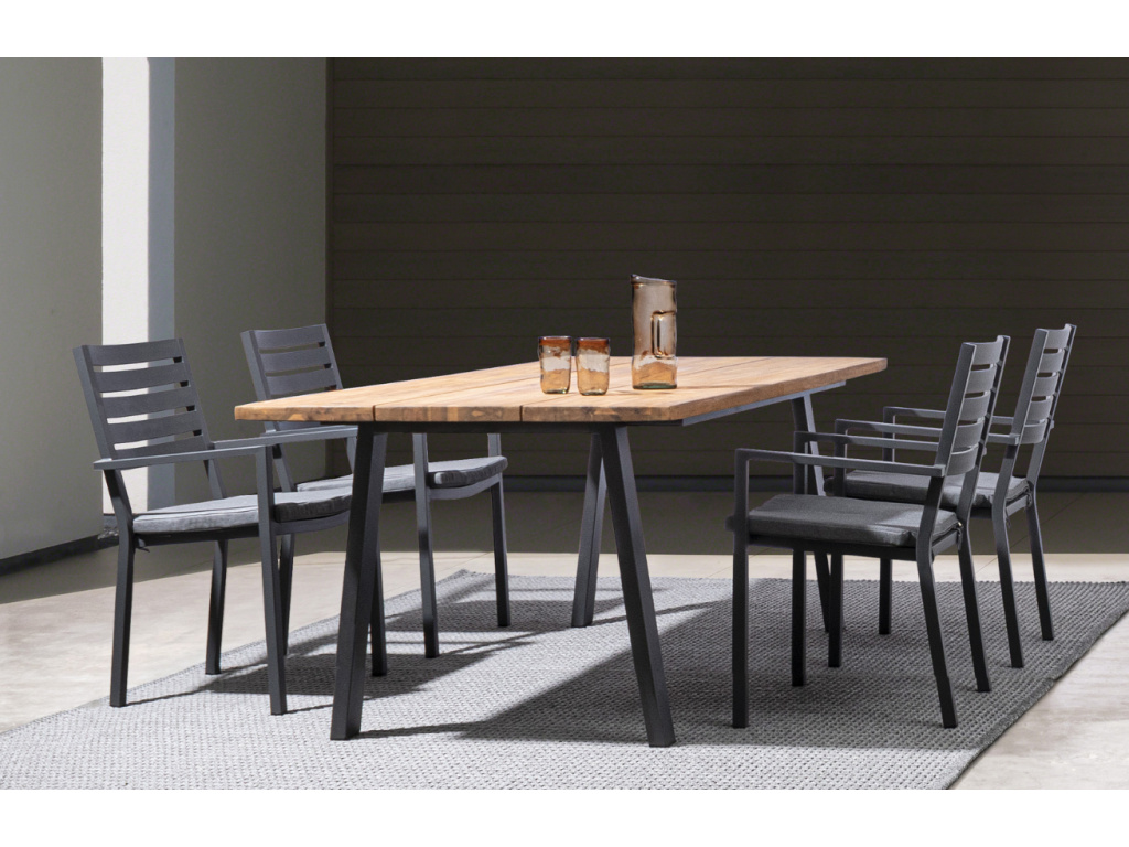Moderní zahradní jídelní stůl Bizzotto Oslo vás zaujme kombinací materiálů a svým jednoduchým, ale účelným designem. Deska stolu je masivního akátového dřeva, navíc ošetřeného olejovou povrchovou úpravou. Jednotlivé lamely se od sebe můžou jemně lišit velikostí a texturou, díky čemuž bude každý stůl skutečným originálem. Bytelná podnož je z černě lakovaného kovu. Stůl Oslo nabízí místo až pro 8 osob a díky jeho stylu jej bude lehké kombinovat s ostatními kusy nábytku.