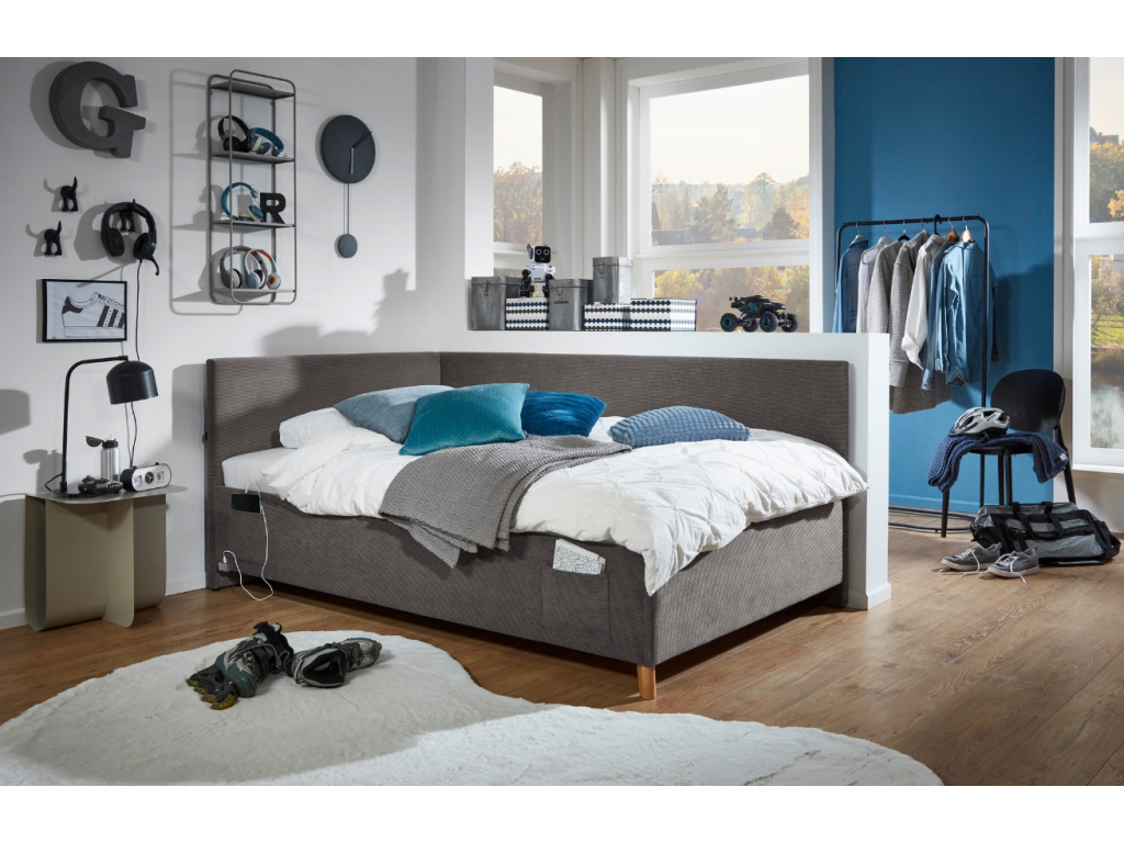 Stylová postel Cool s manšestrovým čalouněním je skvělou volbou pro dětské i studentské pokoje. Na jejím boku najdete prostorné kapsy, do kterých se vejde vše, co bude potřeba mít před spaním po ruce – knížka, časopis, herní konzole i drobné hračky či brýle na čtení. Dalším praktickým detailem je zabudovaný výstup pro USB i USB-C, díky kterému je možné nabíjet telefon, MP3 přehrávač nebo třeba hodinky. Postel Cool je navíc dostupná ve čtyřech barvách, ze kterých si vyberou kluci i holky. K dostání je také varianta bez bočního panelu.