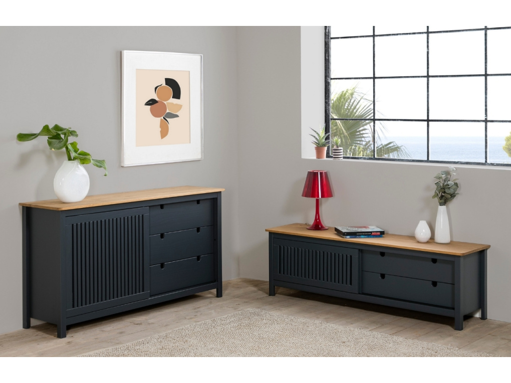 Antracitově šedá komoda Bruna od značky Marckeric ze stejnojmenné řady nábytku nabízí praktický úložný prostor v podobě 3 zásuvek a uzavřených polic s posuvnými dvířky. Komoda Bruna si najde své místo nejen v obývacím pokoji, ložnici, ale i v pracovnách. Obdélníkový matně lakovaný korpus z masivního borovicového dřeva je kontrastně doplněn horní deskou, která je zanechaná v přírodním borovicovém odstínu. Zkombinujte tento kousek také s ostatními produkty řady Bruna, získejte díky tomu dokonalou souhru nábytku ve vašem interiéru.