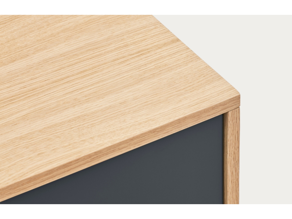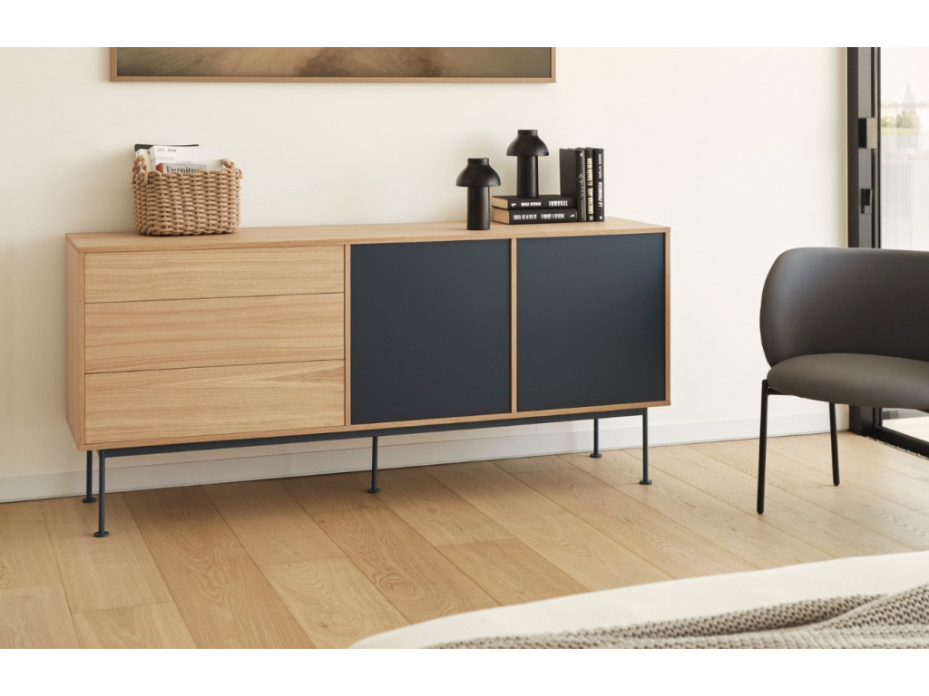 Stylová komoda Teulat Yoko zaujme na první pohled svým neobyčejným designem. Kombinace korpusu z dubové dýhy, dvířek z lakované MDF v antracitově šedé barvě a kovové podnože ve stejné barvě vnese do vašeho interiéru moderní a trendy prvek. Komoda disponuje 4 uzavřenými policemi a 3 prostornými zásuvkami, které vytváří praktické a prostorné úložiště, kam pohodlně uložíte váš inventář. Komoda se skvěle hodí do moderních interiérů. Doporučujeme kombinovat s dalšími produkty z řady Yoko.
