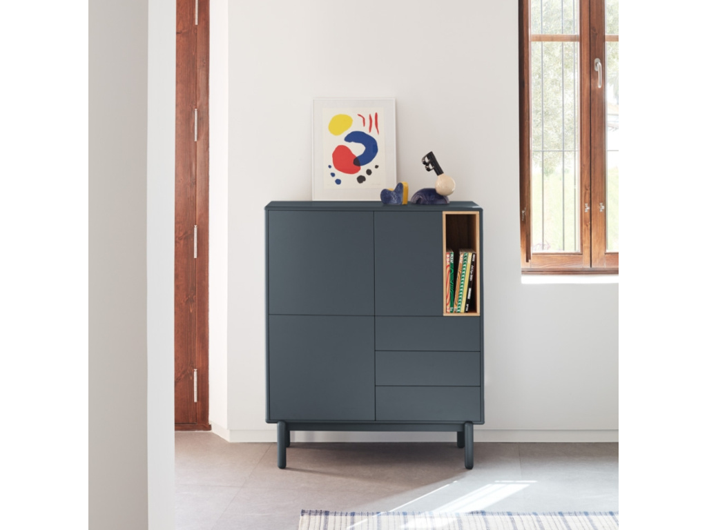 Komoda Teulat Corvo v antracitově šedé barvě vás na první pohled zaujme svým minimalistickým designem a různorodě řešeným a velkým úložným prostorem. Korpus komody je z lakovaného MDF, které si oblíbíte pro snadnou údržbu. Úložný prostor se skládá z několika polic za uzavíratelnými dvířky a tří vysouvacích zásuvek. Monotónní barva komody je zpestřena jednou kontrastní policí s dubovou dýhou. Bytelná podnož je z masivního dřeva.