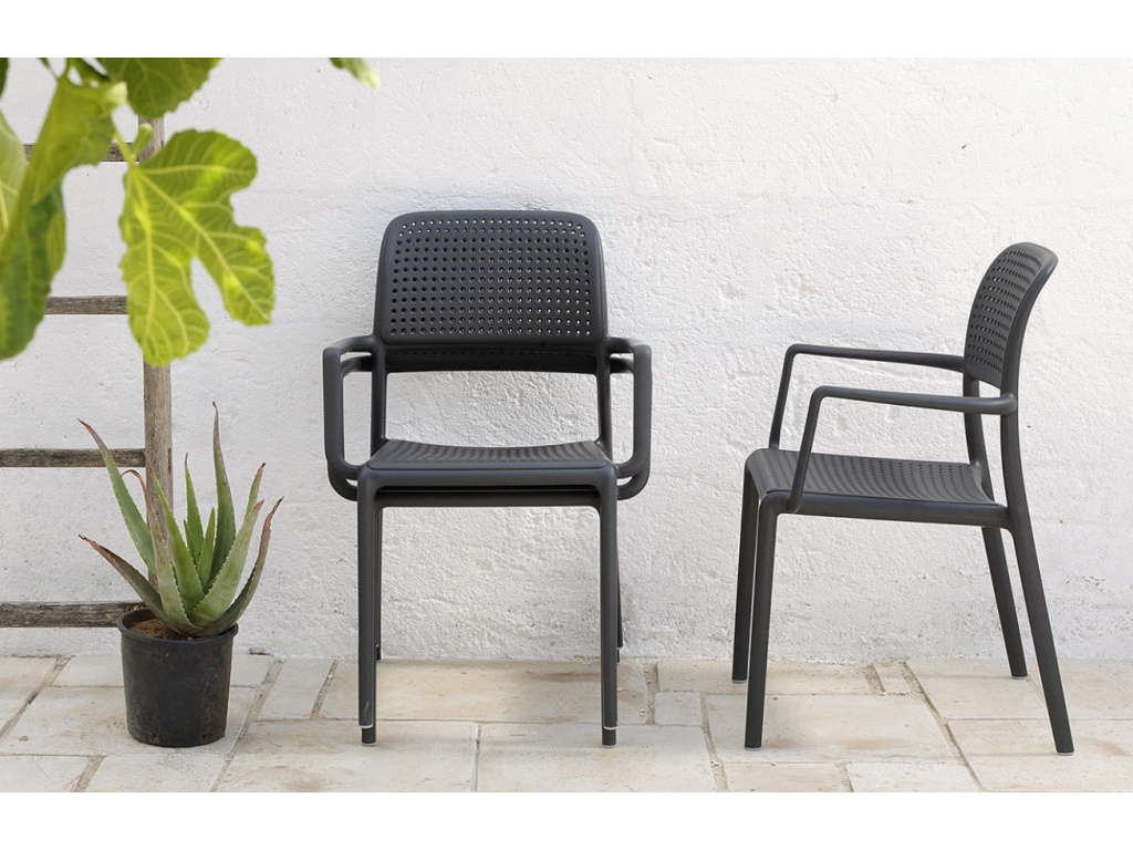 Zahradní židle Bora s područkami je moderní kousek nábytku, který díky použitému materiálu oceníte nejen v interiéru, ale i na vaší terase či v zahradě. Jednoduché barevné provedení a působivý design dělá z této židle nadčasový prvek, který rozhodně neomrzí. Židle Bora je dostupná v několika barevných variantách. Vychutnejte si zasloužený komfort a styl židle i u vás doma. Bora se skvěle hodí jak do komerčních, tak i nekomerčních prostor.