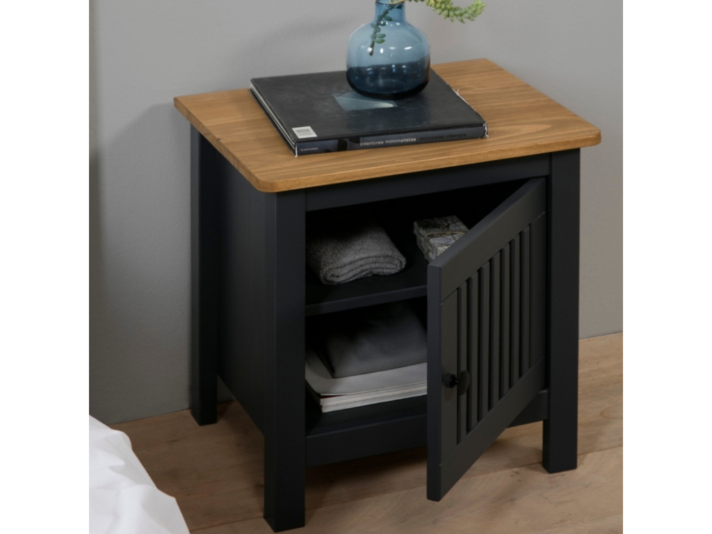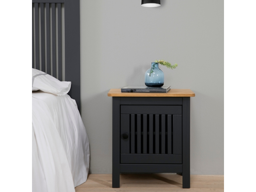 Noční stolek Bruna od značky Marckeric v antracitově šedé barvě vyrobený z masivního borovicového dřeva se stane praktickým a stylovým doplňkem vaší ložnice. Obdélníkový matně lakovaný korpus z masivního dřeva nabízí praktický úložný prostor s dvířky a s kovovými úchyty. Atraktivní kontrast dodává horní deska stolku, která je zanechaná v přírodním borovicovém odstínu. Doporučujeme tento noční stolek kombinovat také s ostatními produkty řady Bruna, získáte díky tomu dokonalou souhru nábytku ve vašem interiéru.