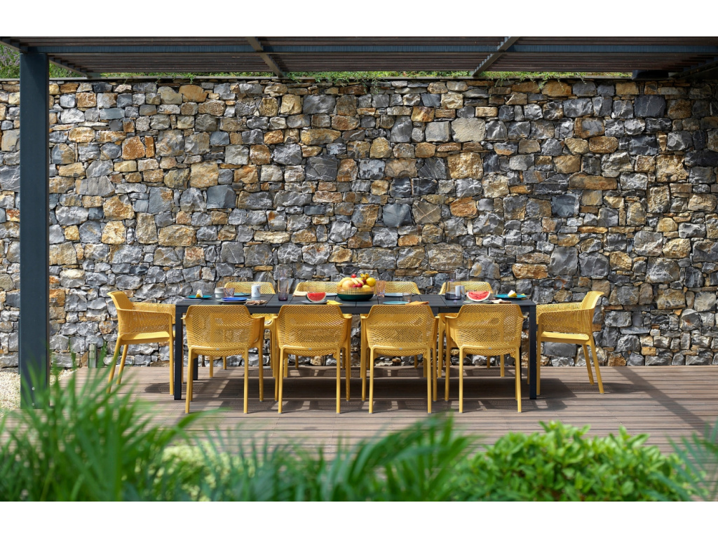 K vašim venkovním oslavám můžete zasednout u rozkládacího stolu Rio značky Nardi, který se díky jednoduché rozkládací funkci snadno prodlouží až do šířky 280 cm. Je vyrobený z odolného lakovaného hliníku, který vyniká svou odolností a snadnou údržbou. Jeho deska je tvořena lamelami s jemným vzorem, díky kterému získávají na zajímavosti. Stůl se tak skvěle hodí také pro komerční využití – co takhle k němu usadit hosty na zahrádce vaší kavárny nebo restaurace?