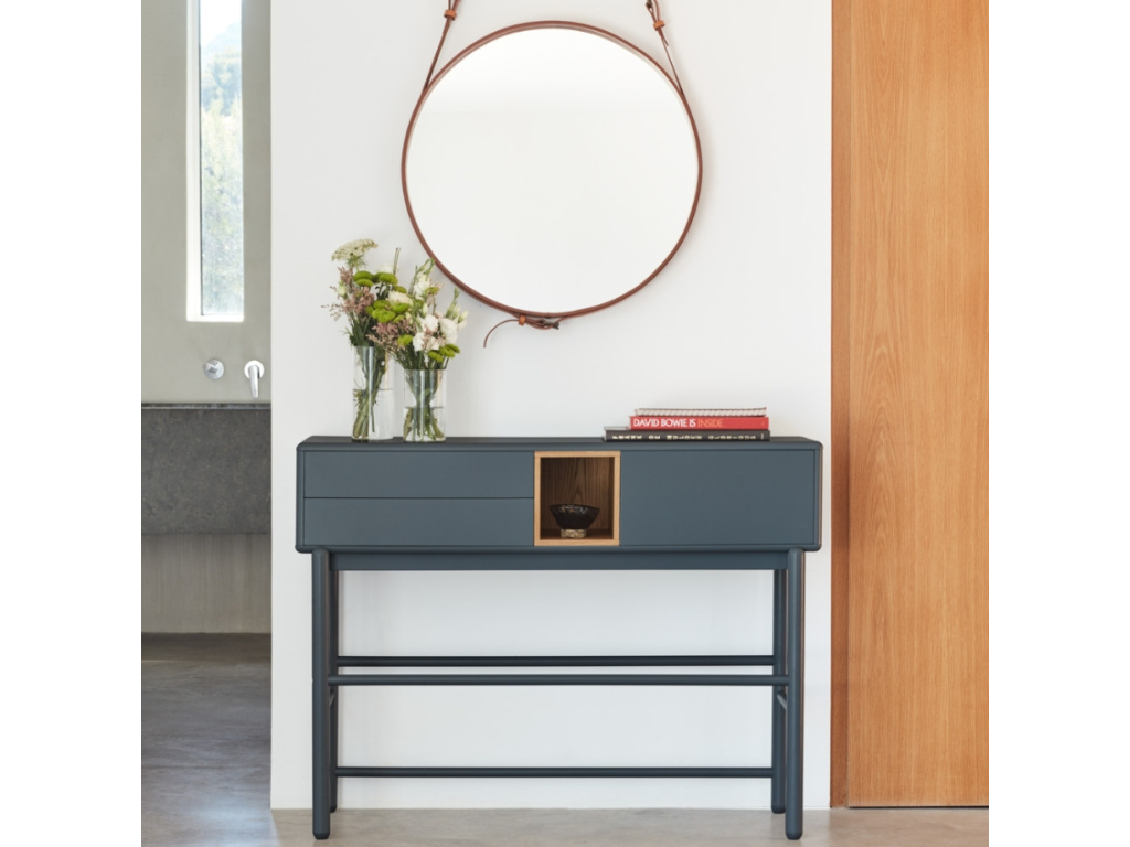 Toaletní stolek Teulat Corvo v elegantní antracitové barvě vás na první pohled zaujme svým minimalistickým designem a různorodě řešeným úložným prostorem. Korpus stolku je z lakovaného MDF, které si oblíbíte pro snadnou údržbu. Úložný prostor se skládá z jedné police za uzavíratelnými dvířky a dvou vysouvacích zásuvek. Monotónní barva stolku je zpestřena jednou kontrastní poličkou s dubovou dýhou. Bytelná podnož je z masivního dřeva.