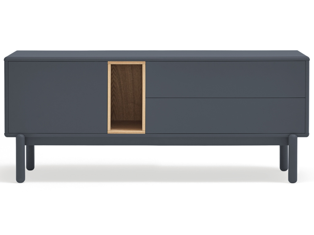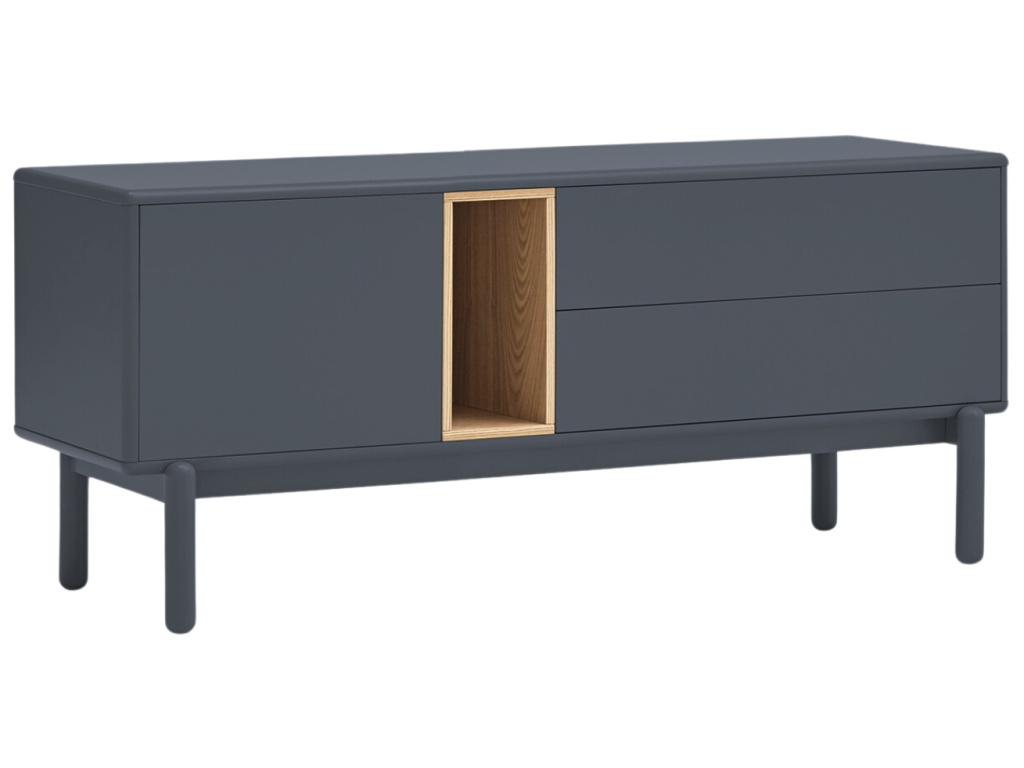 Televizní stolek Teulat Corvo v antracitově šedé barvě vás na první pohled zaujme svým minimalistickým designem a dostatečně velkým úložným prostorem. Korpus stolku je z lakovaného MDF, které si oblíbíte pro snadnou údržbu. Design stolku zaujme jednou kontrastní policí s dubovou dýhou. Bytelná podnož je z masivního dřeva.