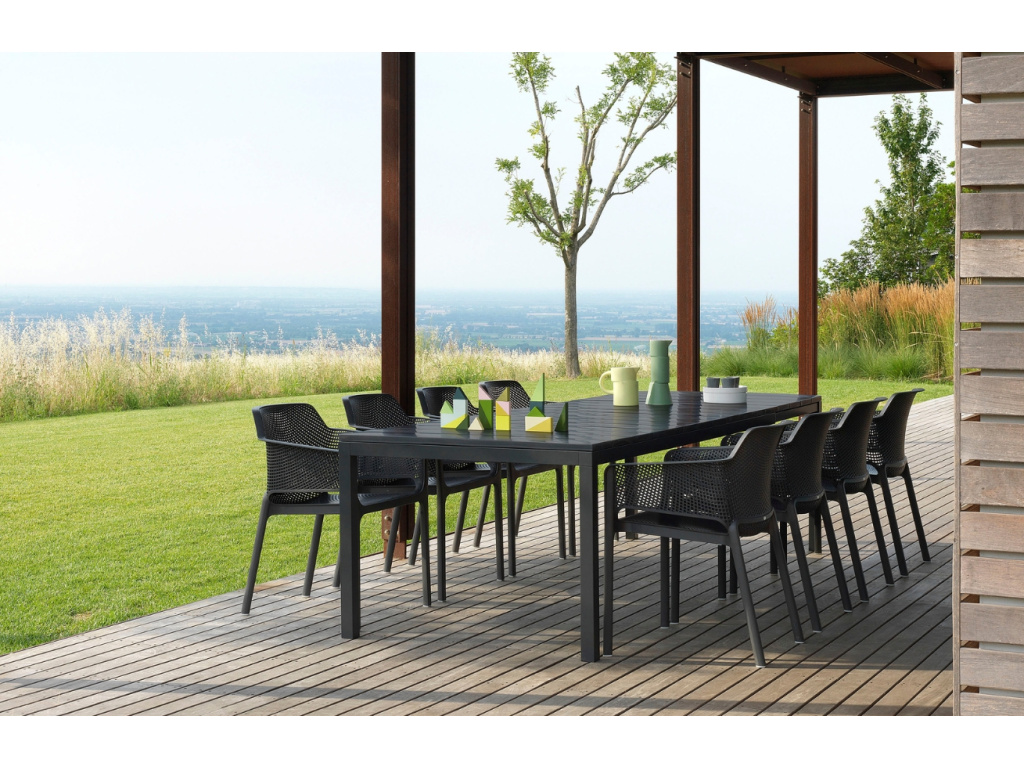 K vašim venkovním oslavám můžete zasednout u rozkládacího stolu Rio značky Nardi, který se díky jednoduché rozkládací funkci snadno prodlouží až do šířky 280 cm. Kromě provedení s deskou z lakovaného hliníku nyní značka Nardi přichází také s verzí DurelTOP. Tato deska je vyrobena z odolného polypropylenu, vyvinutého s cílem dosáhnout nejvyšší úrovně praktičnosti, odolnosti a elegance. Navíc je tento materiál odolný vůči vodě i slunečnímu záření a snadno se čistí – zkrátka je jako stvořený pro exteriérové využití. Stůl se tak skvěle hodí nejen pro domácí rodinné oslavy a grilovačky, ale také pro komerční využití – co takhle k němu usadit hosty na zahrádce vaší kavárny nebo restaurace?