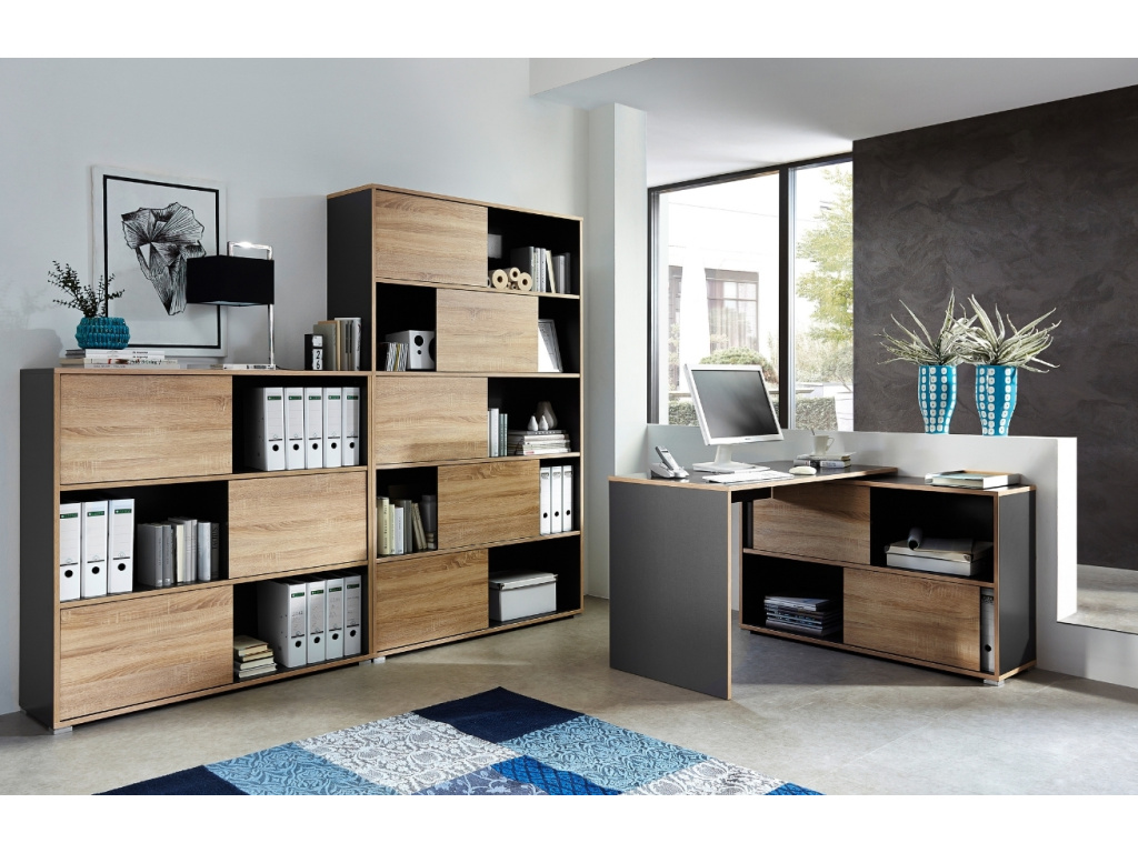 Kancelářský stůl s regálem Slide splní i ty nejvyšší nároky. Regál je velice prostorný a pojme velké množství věcí. Kombinace černé barvy a dubového dekoru působí moderním dojmem s nádechem oblíbeného skandinávského stylu. Hodí se do světlých kanceláří a pracoven.