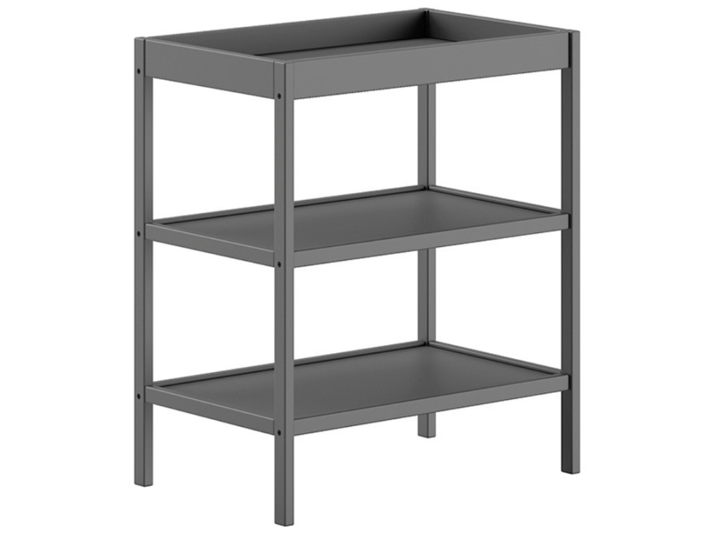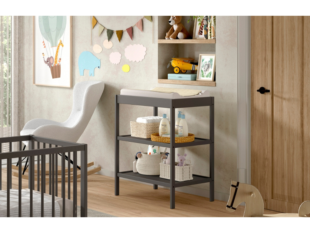 Přebalovací pult Dino v antracitovém odstínu je spolehlivým pomocníkem pro každodenní péči o miminko. Nabízí prostornou plochu na přebalovací podložku a dvě praktické police, kam snadno uložíte pleny, ubrousky i dětskou kosmetiku. Díky pevné bukové konstrukci hravě zvládne každodenní používání. Skvěle ladí s dětskými postýlkami z kolekce Dino, takže si snadno vytvoříte sladěný a funkční koutek pro vaše nejmenší. K dostání je také v přírodní a bílé variantě.