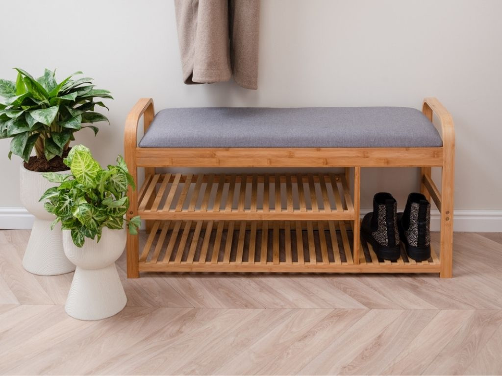 Moderní a praktický takový je bambusový botník Hina. Do jeho úložného prostoru se pohodlně vejde až jedenáct párů bot. Botník má jednu polici a větší prostor pro vyšší obuv. Zajisté oceníte také praktický šedý sedák, díky kterému bude nazouvání a vyzouvání bot mnohem pohodlnější.