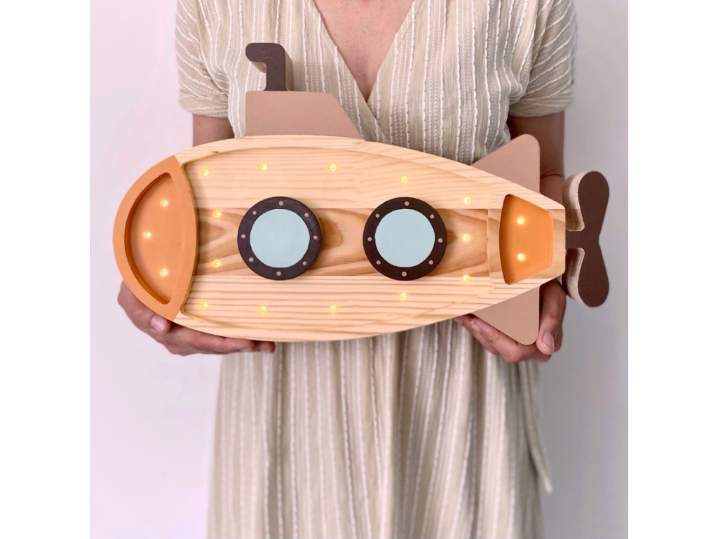 Tato originální lampička ve tvaru ponorky od Peekaboo bude funkčním doplňkem a zároveň kouzelnou dekorací do dětského pokoje! Pyšní se ruční výrobou z masivního borovicového dřeva polských lesů, a je natřena bezpečnými akrylovými barvami. Má energeticky úsporné LED diody s velmi dlouhou životností, které poskytují příjemné teplé světlo. Lampička funguje na AA baterie, díky kterým ji lze snadno umístit kamkoliv dle potřeby. Kryt baterie je zajištěn šrouby, aby jej žádná malá zvídavá ručka nerozbila. Pro děti, které se bojí tmy, bude tato lampička ideálním společníkem při usínání.