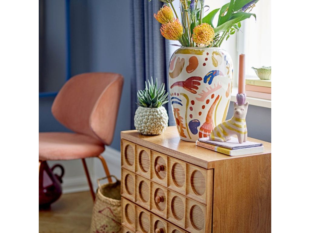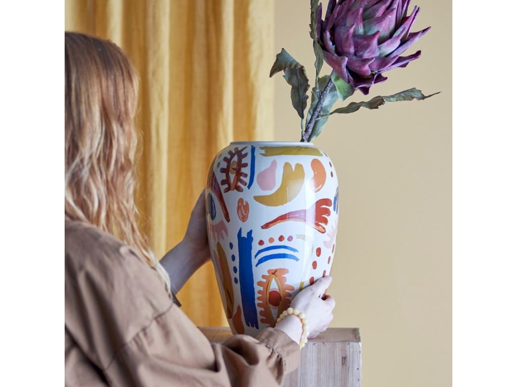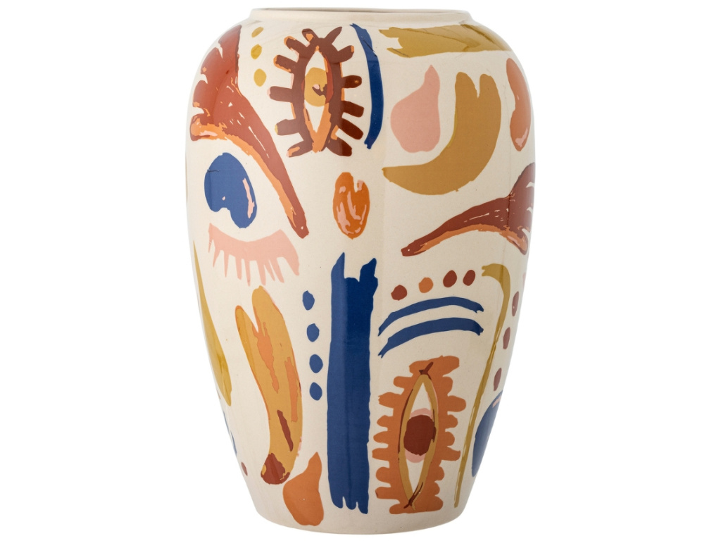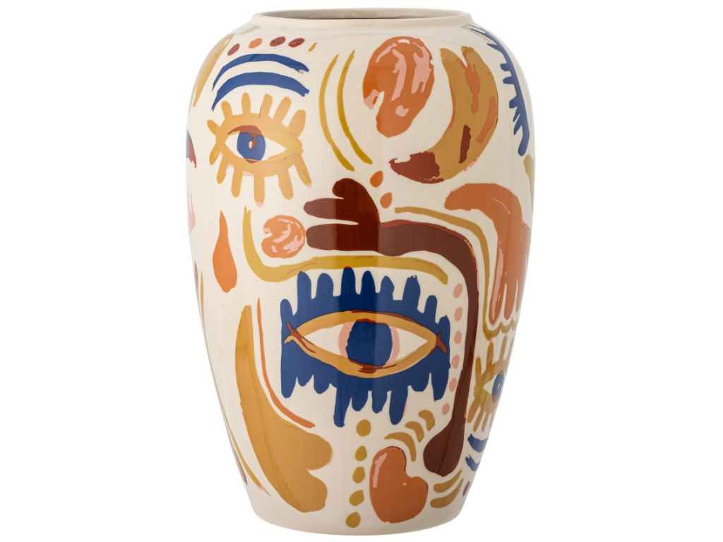 Váza Horus od značky Bloomingville je nádherným kouskem, který okamžitě upoutá pozornost. Její výrazný design s motivy očí a abstraktními tvary v kombinaci teplých a studených tónů vytváří harmonickou atmosféru. Tato váza je ideálním doplňkem do jakéhokoli interiéru, ať už ji použijete pro čerstvé květiny, nebo ji necháte jako samostatný dekorativní prvek. S její pomocí můžete ozdobit jakýkoli kout, ať už v obývacím pokoji, na poličce nebo na konferenčním stolku, kde se stane středobodem pozornosti a podtrhne osobitý charakter vašeho domova.