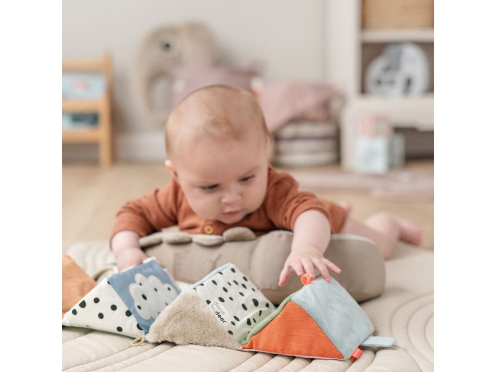 Rozkládací látková kostka Deer friends od značky Done by Deer pomůže zbystřit smysly vašeho děťátka a zabavit ho na dlouhé chvíle. Kontrastní a pestré barvy budou stimulovat mysl miminka, zvyšovat koncentraci a rozvíjet motorické schopnosti. Díky jemné látce a měkoučké výplni se drobeček o kostku neporaní a může s ní trénovat polohu na bříšku. Látkové cedulky zabaví prstíky a šustivé zvuky zaujmou dětská ouška. Kostku lze jednoduše rozložit, vytvořit z ní například domeček pro plyšové kamarády, poté znovu složit a pomocí suchého zipu jednoduše zapnout.