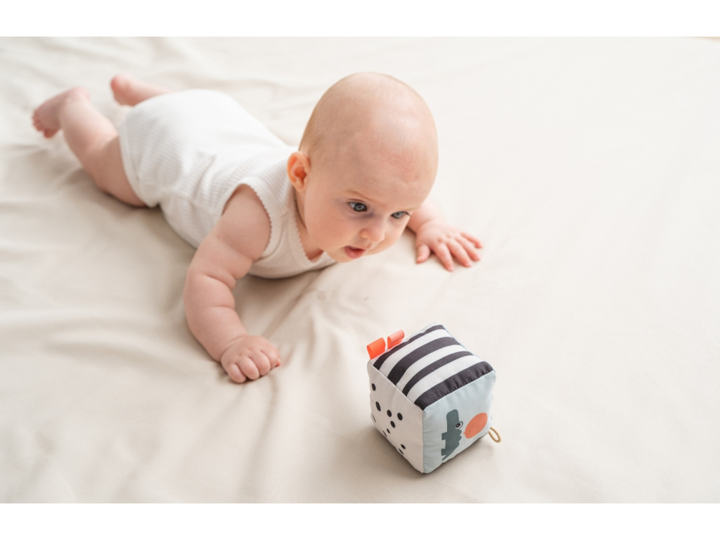 Barevná kostka Happy clouds od značky Done by Deer pomůže zbystřit smysly vašeho děťátka a zabavit ho na dlouhé chvíle. Kontrastní a pestré barvy budou stimulovat mysl miminka, zvyšovat koncentraci a rozvíjet motorické schopnosti. Díky jemné látce a měkoučké výplni se drobeček o kostku neporaní a může s ní trávit i chvilky v postýlce. Látkové cedulky zabaví prstíky a šustivé zvuky zaujmou dětská ouška. Plastový kroužek zajistí, že kostku můžete kamkoliv zavěsit.