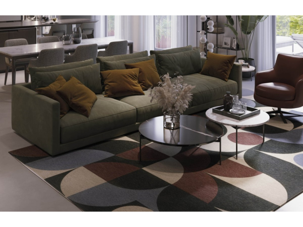 Designový koberec Deco od značky Fargotex bude pestrobarevným doplňkem pro zpestření vašeho obývacího pokoje, ložnice či jídelny. Geometrické vzory dokonale kontrastují s odstíny zemité hnědé, černé a modré. Koberec je odolný vůči skvrnám a při čistění i proti poškození struktury materiálu. Ochranná technologie Magic Home zabraňuje koberci absorbovat rozlitou kapalinu a zanechá kapky na tekutiny na povrchu látky. Koberec Deco perfektně zapadne do retro, art deco, glamour i moderně laděných interiérů.