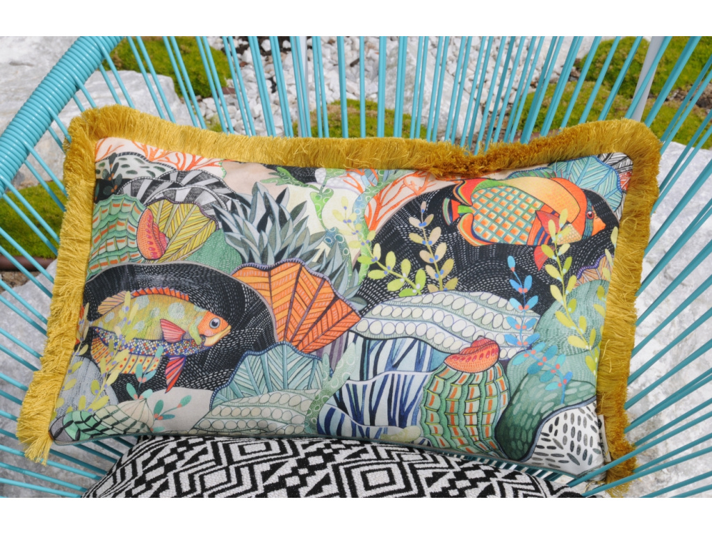 Povlak na polštář Marine od české značky BOHOLOGY zaujme na první pohled originálním motivem podmořského světa. Okraje lemují bohaté třásně ve žluté barvě a druhá strana povlaku je jednobarevná, takže pokud zatoužíte po změně, můžete polštář kdykoliv otočit a vzor tak na chvíli skrýt. Povlaky BOHOLOGY jsou ušity z kvalitních anglických látek Osborne&Little, které se vyznačují výraznými barvami a nádhernými vzory, které vznikají pod rukama světových návrhářů. Tyto látky jsou navíc vhodné i pro venkovní použití, jsou tudíž ideální na zahradu nebo balkon, kde snesou i nečekaný déšť. Po stranách mají skrytý zip, díky čemuž lze povlak sundat a prát.