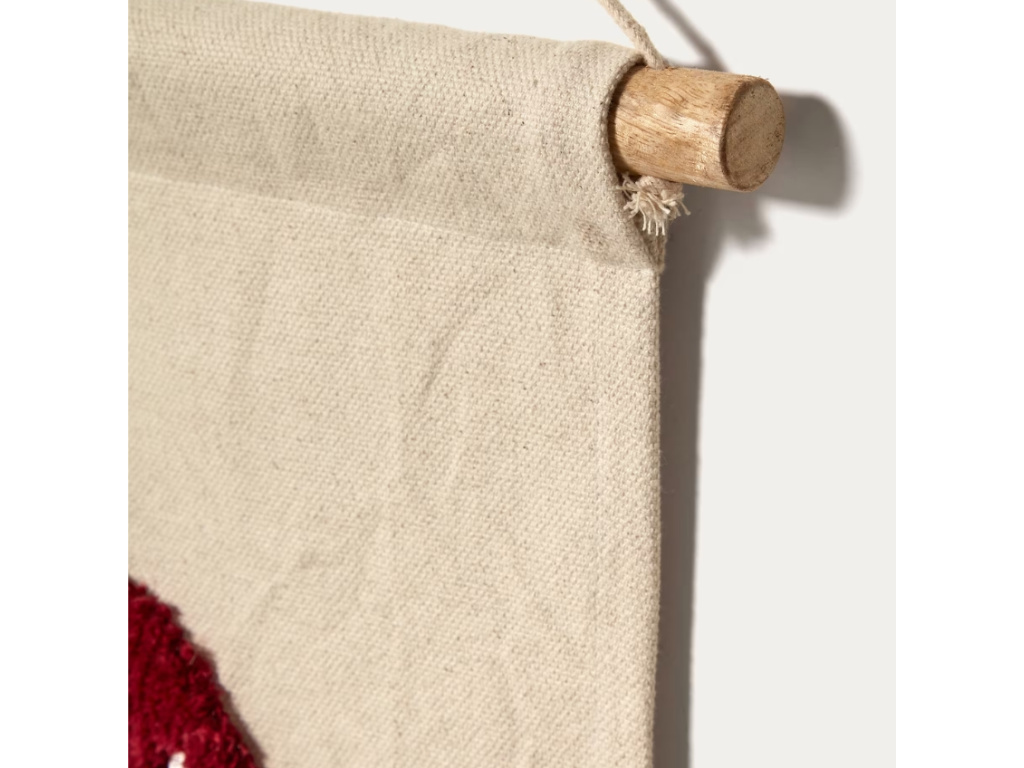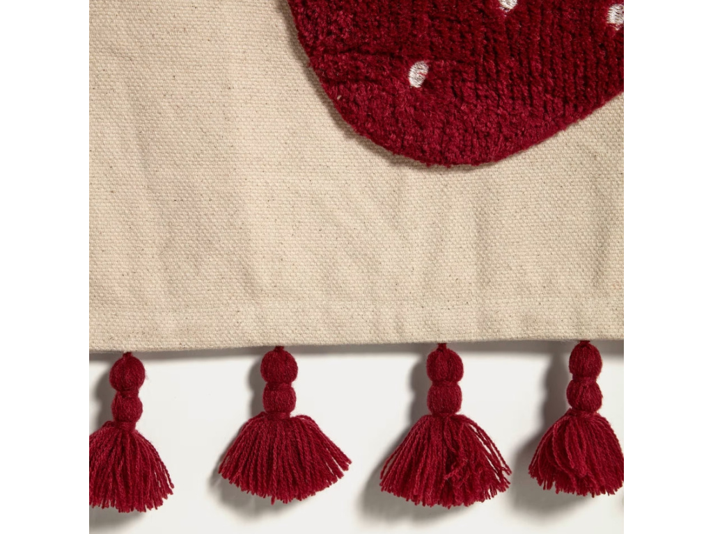 Nástěnná dekorace Amarantha může zdobit dětský pokoj každého malého milovníka ovoce. Je vyrobena ze 100% bavlny v kombinaci s borovicovým dřevem a zaujme svým reliéfem v podobě tmavě červené jahody a ozdobnými střapci ve stejné barvě. Díky veselému a barevnému motivu, který je velmi příjemný na dotek, vytváří Amarantha hravý vzhled interiéru. Lze ji kombinovat se zbytkem kolekce, navržené v moderním a udržitelném severském stylu.