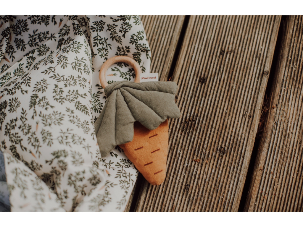Chrastítko s kousátkem Carrot od Malomi Kids je ideální hračkou, když dětem začínají růst zoubky. Látkové chrastítko v podobě mrkve je vyrobené z jemné bavlny, a bude skvělým pomocníkem při rozvíjení motorických dovedností děťátka. Je připevněné k dřevěnému kousátku, které je vyrobené z bukového dřeva a není lakované ani impregnované. Hračka bude skvělá při prořezávání zoubků a zároveň vašeho andílka zabaví.