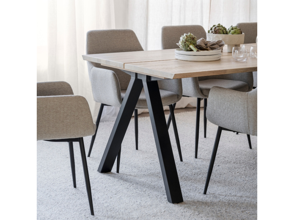 Elegantní jídelní stůl ROWICO CARRADALE nabízí prostornou obdélníkovou desku z masivního dubového dřeva. Ta je vkusně doplněna kovovou podnoží, která zaujme svým tvarem - připomíná písmeno V. Stůl bude vypadat skvěle především ve světlých interiérech doplněný o čalouněné židle – doporučujeme se podívat například na sérii židlí NORWELL nebo SIERA od ROWICA. Vaše jídelna získá s tímto krasavcem úplně jiný, seriózní a nadčasový vzhled. Neváhejte a dopřejte vašemu rodinnému stolování styl.