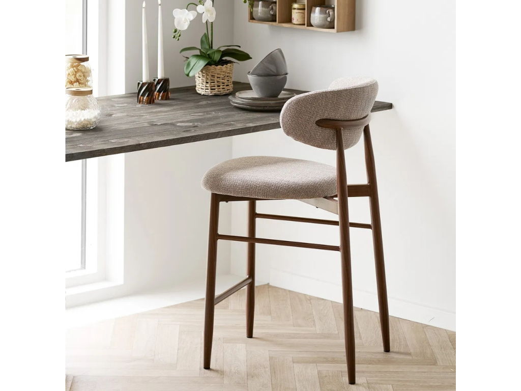 Barová židle Levantio v sobě spojuje jednoduchost a přirozenou eleganci, díky nimž snadno zapadne do moderní i skandinávsky laděné kuchyně. Měkké čalounění v béžovém odstínu vytváří útulný dojem a vybízí k pohodlnému posezení, zatímco štíhlá podnož v hnědém dekoru dodává židli harmonický vzhled. Jemně zakřivené opěradlo přináší potřebnou oporu a zároveň podtrhuje nadčasový design. Každý detail působí promyšleně a vytváří vyvážený celek, který zaujme svou lehkostí i stylem. Tento kousek se stane elegantním doplňkem vašeho domova a dodá prostoru klidnou, příjemnou atmosféru.