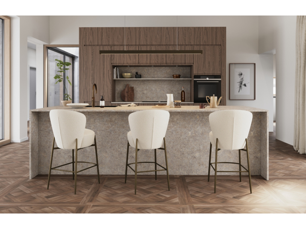 Díky moderní barové židli Orbit v béžové barvě si vytvoříte stylovou jídelnu, která se stane klidným místem k setkání s přáteli či rodinou. Její buclatý tvar sedáku, který vám přinese vytoužené pohodlí a opěradlo v mírně zaobleném tvaru dodávají židli jedinečný vzhled. Barová židle Orbit je čalouněná látkou bouclé, která zútulní vaší domácnost a přinese do ní příjemnou atmosféru. V kombinaci s kovovou lakovanou podnoží s opěrkami na nohy působí židle luxusním dojmem. Váš interiér může být dokonale sladěný – série Orbit nabízí také podnožky, křesla a jídelní židle.