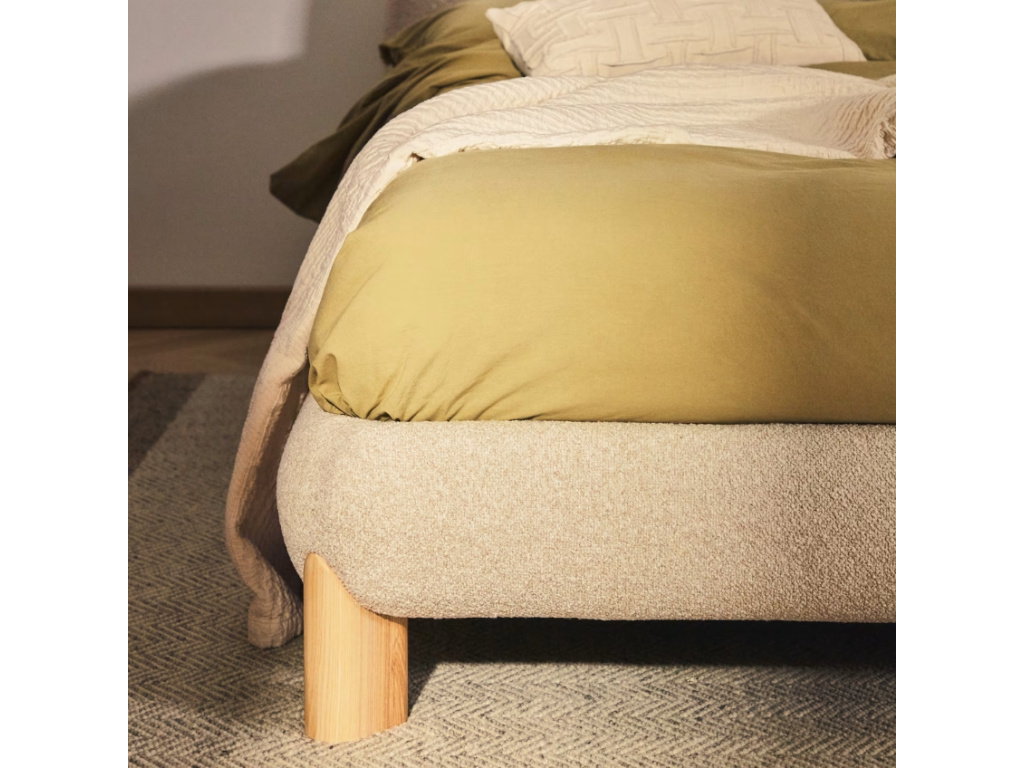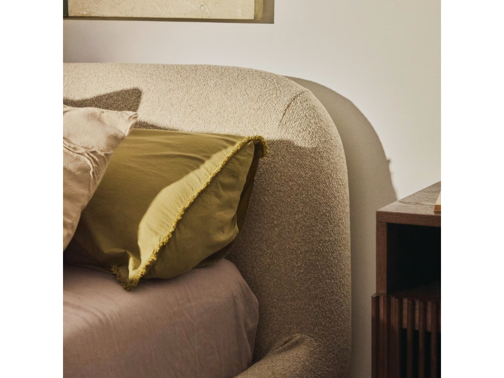 Zaoblené linie rámu i čela dvoulůžkové postele Odina plynule navazují na nohy z masivního jasanu, které decentně vystupují nad úroveň potahu a dodávají jí originální výraz. Výsledkem je nadčasová silueta, která působí útulně a vzdušně – a přitom maximálně elegantně. Bouclé potah z jemně strukturované tkaniny je plně snímatelný a pratelný na studeno, takže vaše ložnice zůstane vždy svěží a upravená. Uvnitř se skrývá pevná konstrukce z kombinace dřeva a pěny různé hustoty, která zajišťuje komfort, odolnost i charakteristický oblý tvar. Díky vyšší podnoži je postel nejen vizuálně lehká, ale také praktická – snadno pod ní projede robotický vysavač. Potahová látka nese certifikaci OEKO-TEX® STANDARD a použité dřevo pochází z odpovědně spravovaných lesů – Odina je tedy postel, ve které se potkává elegance, funkčnost i svědomitý přístup k výrobě.