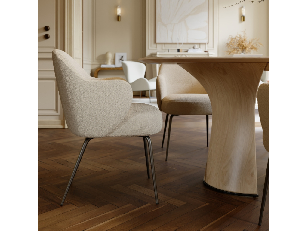 Značka DAN-FORM přichází s jedinečnou řadou židlí Bae, které se svým čistým jednoduchým designem zazáří v každém moderním interiéru. Stanou se skvělým doplňkem pro stylový jídelní stůl v domácnosti – využití ale najdou i v hotelových či komerčních prostorech. Se svým pohodlným polstrováním, čalouněním bouclé látkou a tvarem měkce zaoblených područek, které tvoří prodloužení zad, je židle Bae jedinečným designovým kouskem. Vybrat si ji můžete z několika barevných variant, aby dokonale splnila vaše vizuální preference.