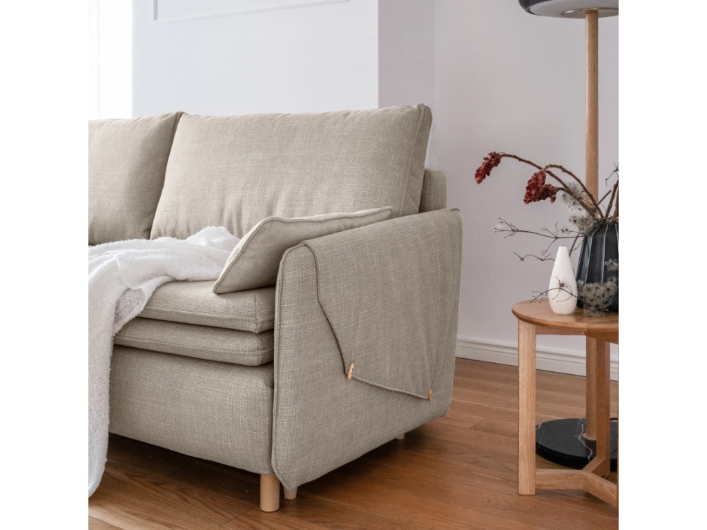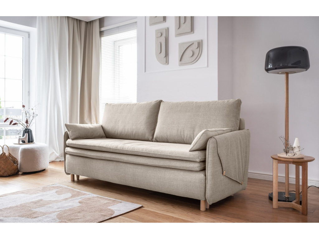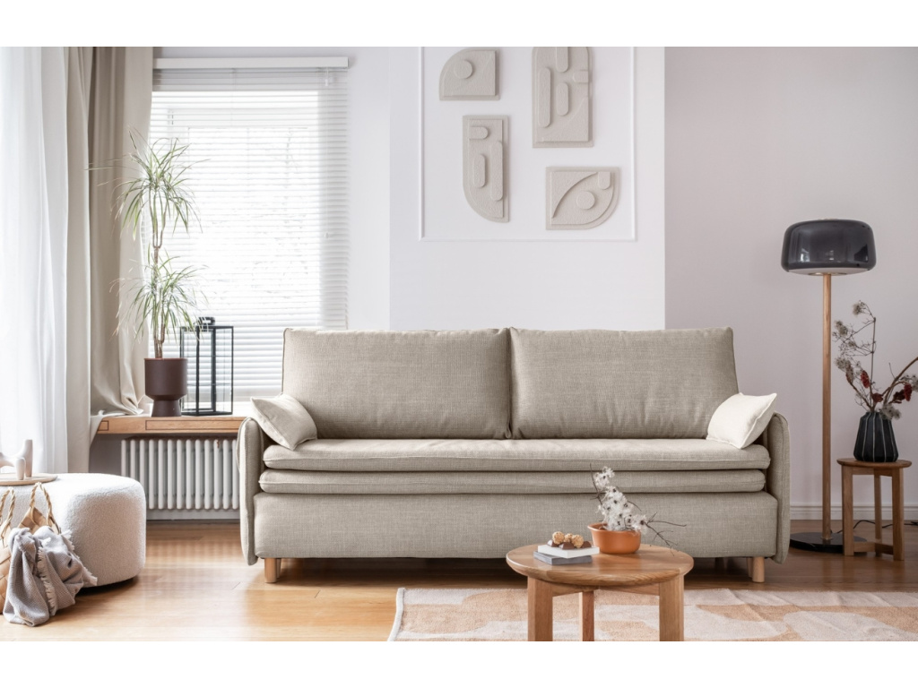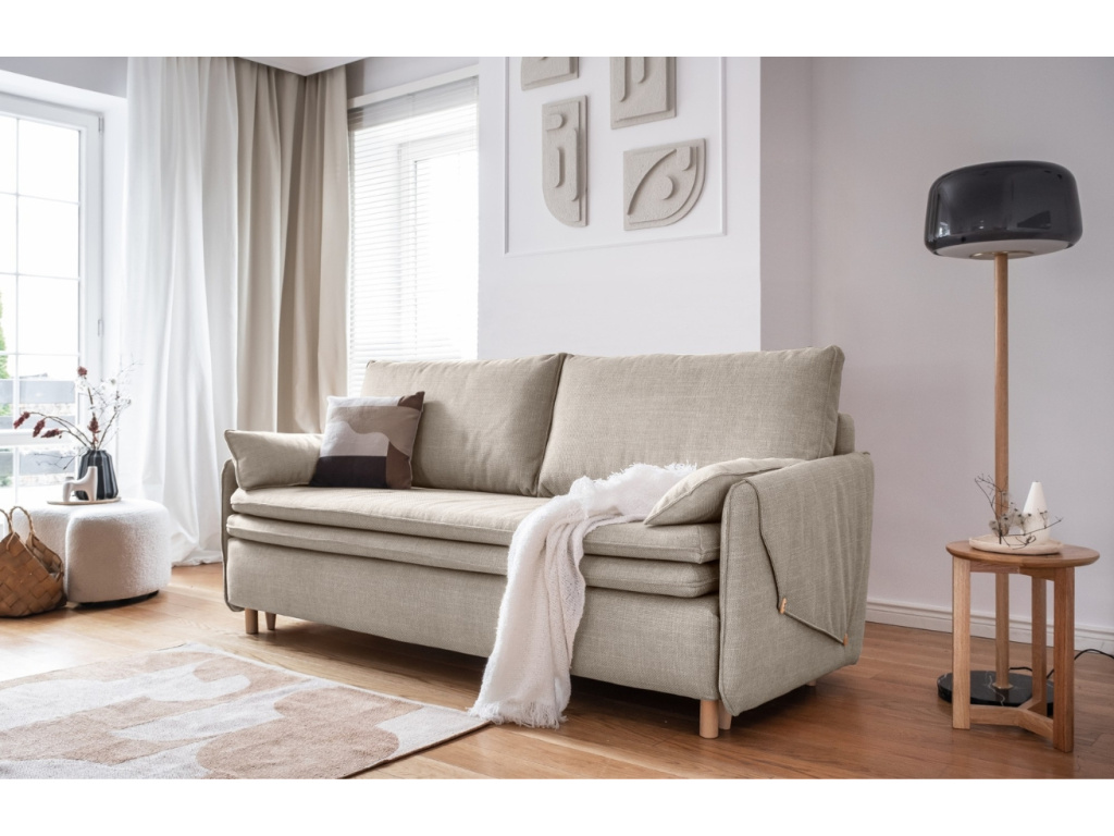 Rozkládací pohovka Simon od značky Miuform představuje ideální řešení do méně prostorných bytů. Pohovka je čalouněna příjemnou látkou, kterou po stranách zdobí dřevěné knoflíky. Zajímavostí této pohovky jsou úzké područky a vyšší dřevěná podnož, díky kterým působí lehkým a vzdušným dojmem. Pohodlný sedák snadno rozložíte na dvě matrace a rázem tak získáte místo na spaní o rozloze 140 x 190 cm. Pohovka nabízí také praktický úložný prostor, kam se pohodlně vejdou polštářky a deky.