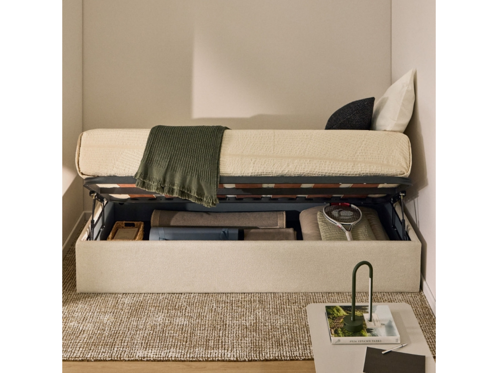 Vyberu siBéžová čalouněná jednolůžková postel Nelzi 90 x 200 cm s bočním úložným prostorem