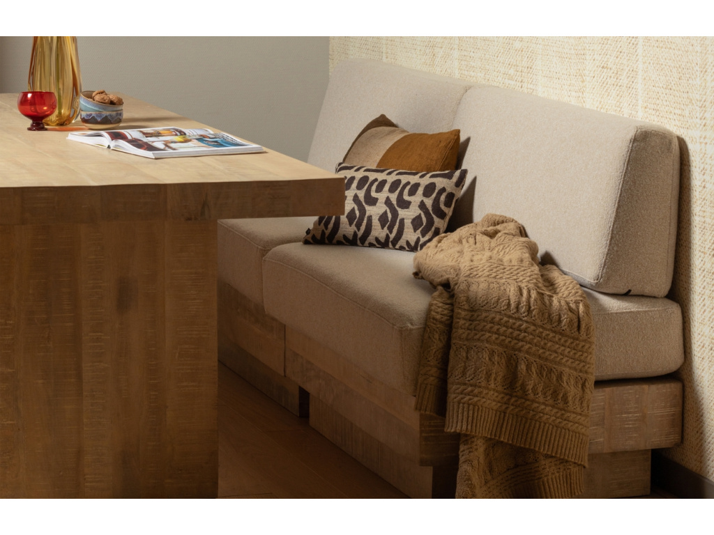 Lavice Kalbon se svým jednoduchým designem nabízí pohodlné posezení u jídelního stolu. Robustní podnož je z mangového dřeva, pro které je typická krásná a výrazná textura. Sedák s opěradlem je potažen na omak příjemnou látkou v béžovém odstínu. Tato kombinace vnese do vašeho domova dávku skandinávské estetiky. Svým jemným, elegantním vzhledem se vám bude dobře kombinovat s ostatním dřevěným nábytkem a bytovými dekoracemi z přírodních materiálů.