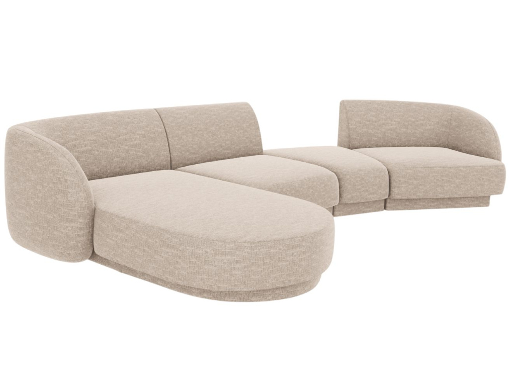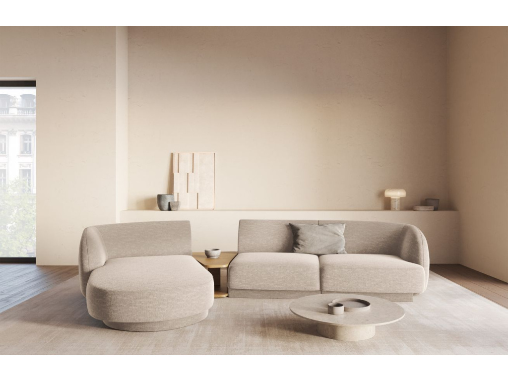 Čtyřmístnou rohovou pohovku Miley od značky Micadoni si zamilujete! Její obloukovitě tvarované opěradlo vybízí k tomu, abyste se na chvíli pohodlně usadili. Mírně zapuštěná základna dodává sezení vznášející se charakter, který dotváří vzhled připomínající oblak. Žinylková potahová látka je velmi příjemná až téměř hedvábná na dotek. Probarvené nitě vytvářejí poutavou 3D strukturu se stínovým a lesklým efektem. Tkanina je velmi odolná proti oděru, díky tomu je pohovka vhodná i do komerčních prostor. Vysoká kvalita a neobyčejný vzhled látky dodávají nábytku sofistikovaný dojem, který umožňuje jeho široké využití v moderním nebo skandinávském stylu. Integrovaný konferenční stolek je nejen designovým prvkem, ale také praktickým místem pro odložení věcí, které chcete mít po ruce, nebo pro umístění dekorací. K pohovce je možné přikoupit další produkty z kolekce Miley. Díky tomu si můžete vytvořit sedací soupravu, kterou je vhodné kombinovat se skleněným nebo dřevěným konferenčním stolkem.