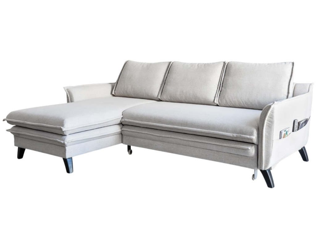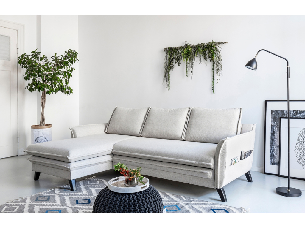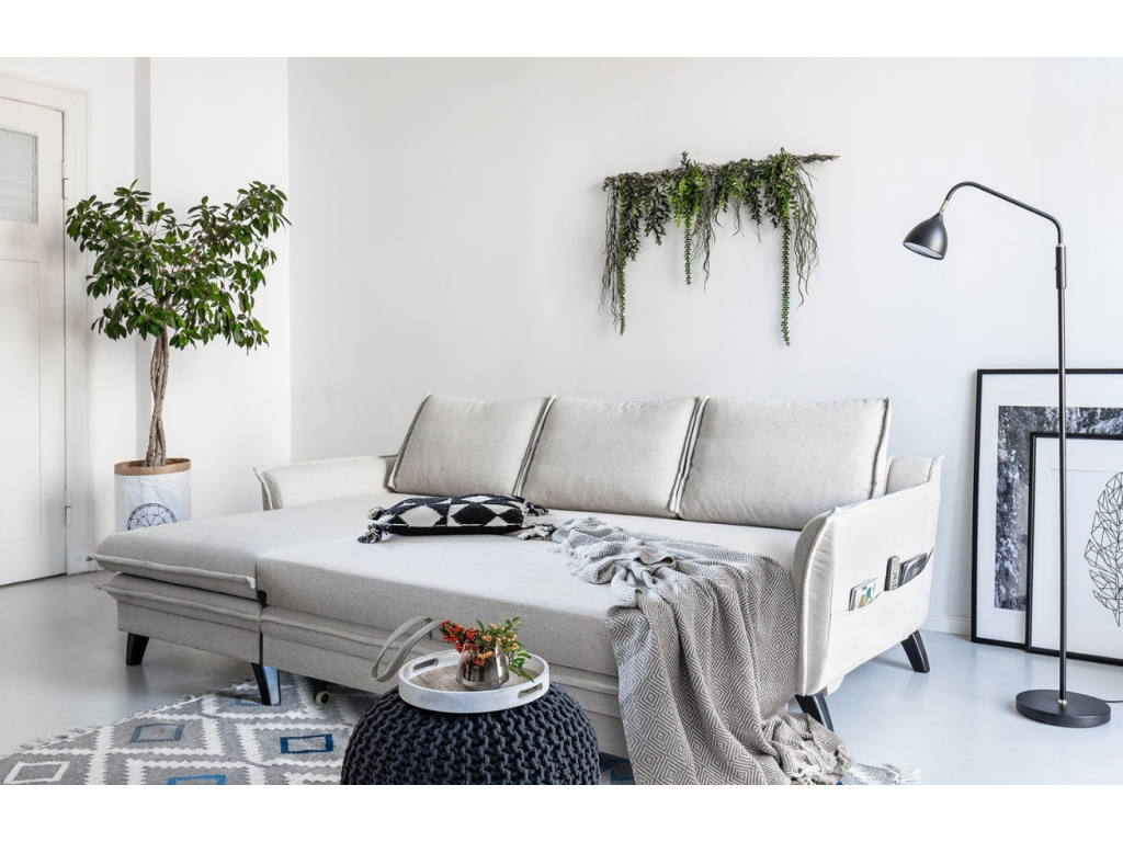 Stylová rohová rozkládací pohovka Charming Charlie od značky Miuform vás zaujme již na první pohled svým stylovým designem. Příjemné čalounění ze strukturované látky v béžovém odstínu dodává pohovce moderní a zároveň minimalistický vzhled. Inovativní použití povrchové matrace, která je nedílnou součástí pohovky, zajišťuje vysoký komfort při spánku. Příjemným bonusem jsou i kapsy na boční straně pohovky, díky kterým získáte praktickou úschovnu pro váš ovladač či oblíbenou knížku. Nechte se okouzlit tímto nadčasovým kouskem, který nabízíme v dalších barvách a provedeních! Doporučujeme ji kombinovat s dalším nábytkem z řady Charming Charlie.