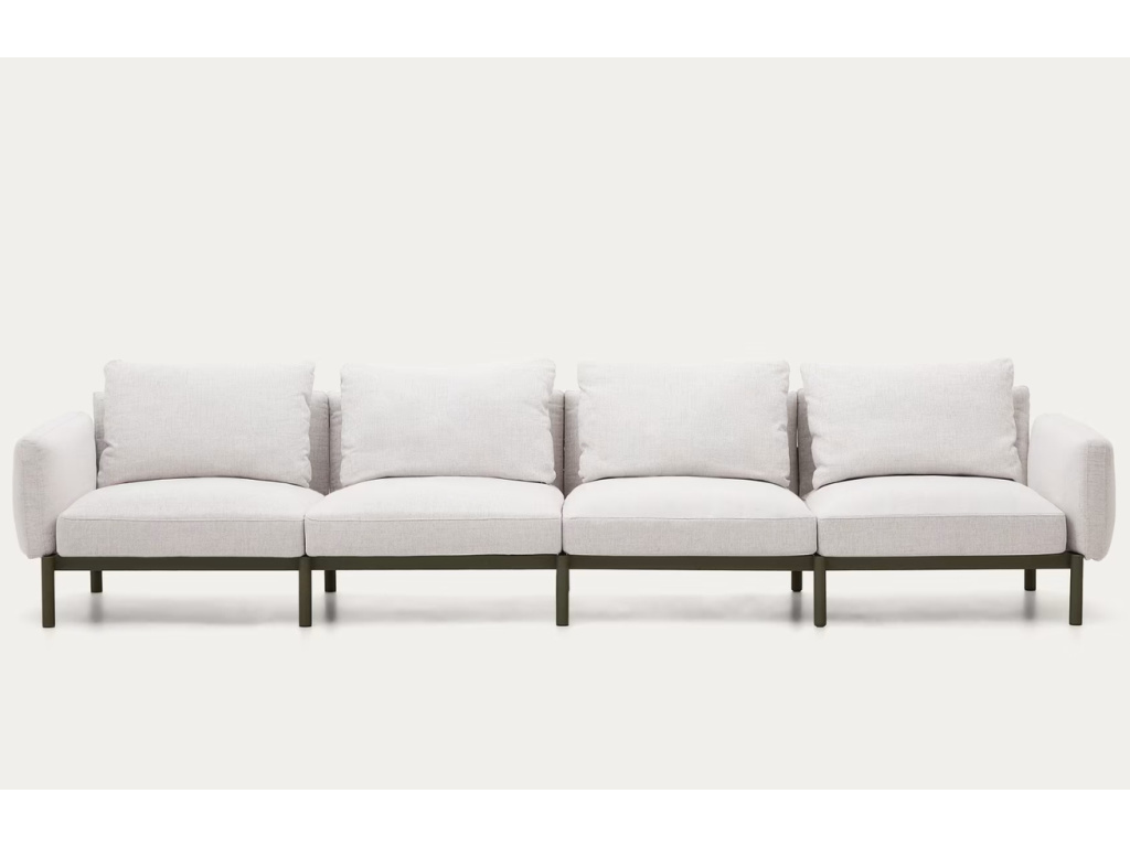 Doplňte svůj venkovní nábytek o designovou pohovku Sorells od Kave Home a vytvořte si na své zahradě oázu klidu. Maximální stabilitu poskytne lakovaná hliníková konstrukce v tmavě zelené barvě, která je odolná vůči korozi a povětrnostním vlivům. Konstrukce je doplněna čalouněnými sedáky s opěradlem, které zajistí vysoký komfort při posezení s přáteli i soukromém odpočinku. Čalounění je odolné vůči UV záření, proto se nemusíte obávat vyblednutí látky. Pohovka nabízí čtyři místa k sezení s pohodlnými odnímatelnými polštáři. Dodejte své zahradě osobitost s kolekcí Sorells, která nabízí pohodlí a styl. Celá série je dostupná v bílém i šedém barevném provedení.
