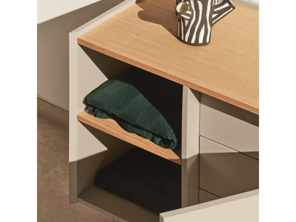 Béžová bezúchytková komoda Otto od španělské značky Teulat je více než jen úložným prostorem. Díky zajímavému minimalistickému designu se tato moderní komoda stane designovým prvkem vašeho interiéru. Základem komody jsou kvalitní lakované MDF a lakovaná kovová podnož, které zajišťují pevnou a stabilní konstrukci. Jemné dřevěné detaily z dubové dýhy vytvářejí zajímavý kontrast. Můžete se těšit na prostorné police, které vám umožní zorganizovat si věci a pomůžou udržovat pořádek. Přestože je komoda bez úchytek, můžete se spolehnout na praktický systém Push to open, který zajistí snadné otevírání. Potěší vás jistě také systém Soft Close, díky kterému se dvířka i šuplíky zavírají pomalu a tiše. Komodu nabízíme ve třech barevných provedeních.