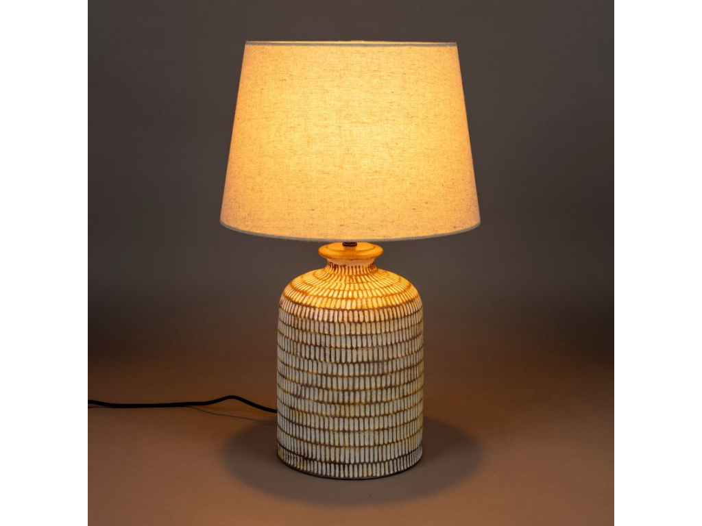 Keramická podstava stolní lampy RUSSEL od značky DUTCHBONE přinese do interiéru pocit útulna s jemným nádechem retra. Lampa se skvěle hodí nejen k osvětlení psacího stolu - využití najde také v chodbě nebo v předsíni. Jemný vzor podstavy není nijak narušen použitým stínidlem - to je jednobarevné, vyrobené z kvalitní lněné látky. Umístit ji můžete do prostor laděných v rustikálním nebo už zmiňovaném retro stylu.
