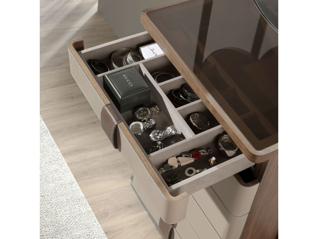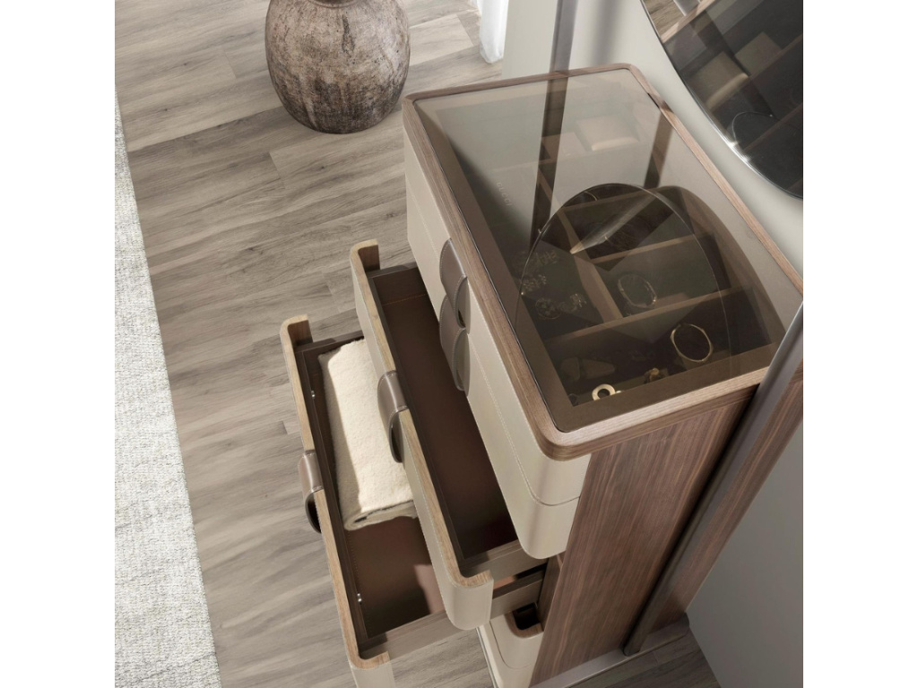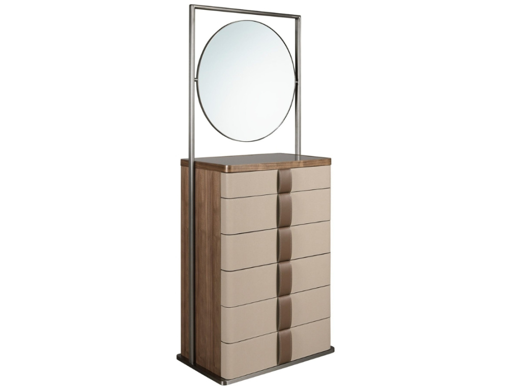 Vdechněte své ložnici moderní eleganci s prostornou komodou od španělské značky Angel Cerdá. Tento výrazný kousek kombinuje přírodní ořechovou dýhu s noblesním čalouněním z hovězí kůže v jemném norkovém odstínu. Jeho jemné linie podtrhuje leštěná ocelová podnož, která dodává celku vzdušnost i pevnost. Celkem 6 prostorných zásuvek s koženými poutky a tichým dovíráním skvěle využijete například v ložnici nebo v šatně. Je navíc vybavena otočným zrcadlem, u kterého můžete kdykoliv zkontrolovat svůj vzhled. Zorganizovat vaše hodinky a šperky pomohou praktické přihrádky první zásuvky, do kterých navíc snadno vidíte i bez otevření zásuvky – díky vrchní skleněné desce. Každý detail této komody působí precizně, promyšleně a mimořádně harmonicky – od barevného ladění až po kontrast materiálů. Doplnit ji můžete dalšími kousky ve stejném designu – nočním stolkem, dalšími komodami i věšáky s úložným prostorem.