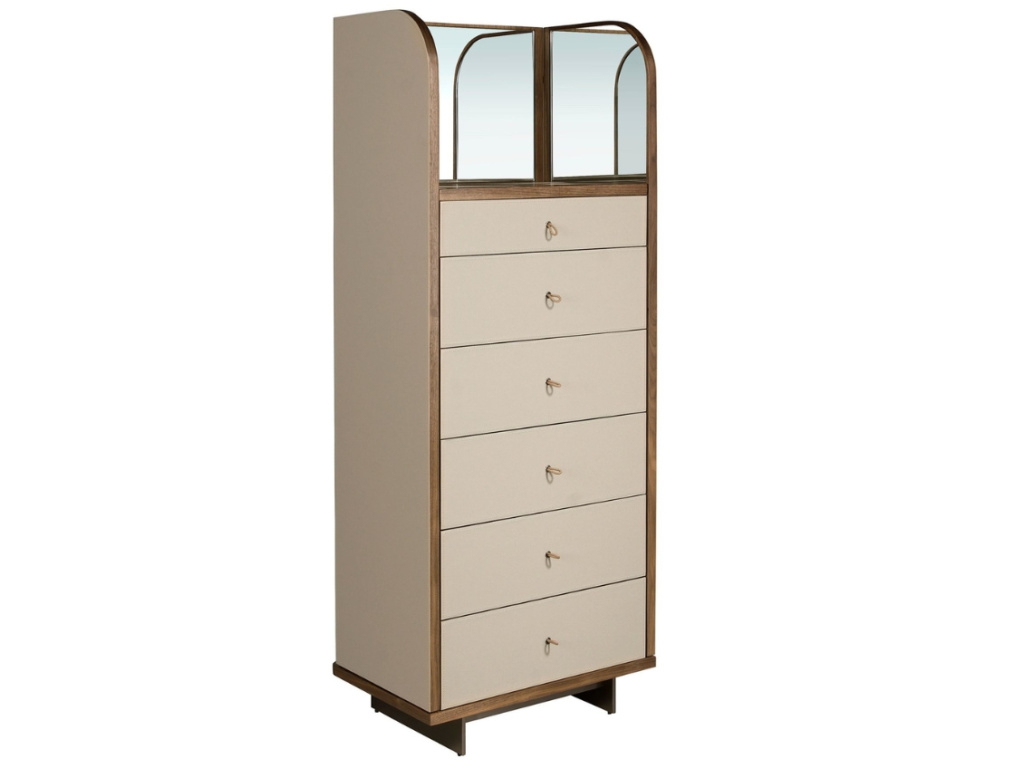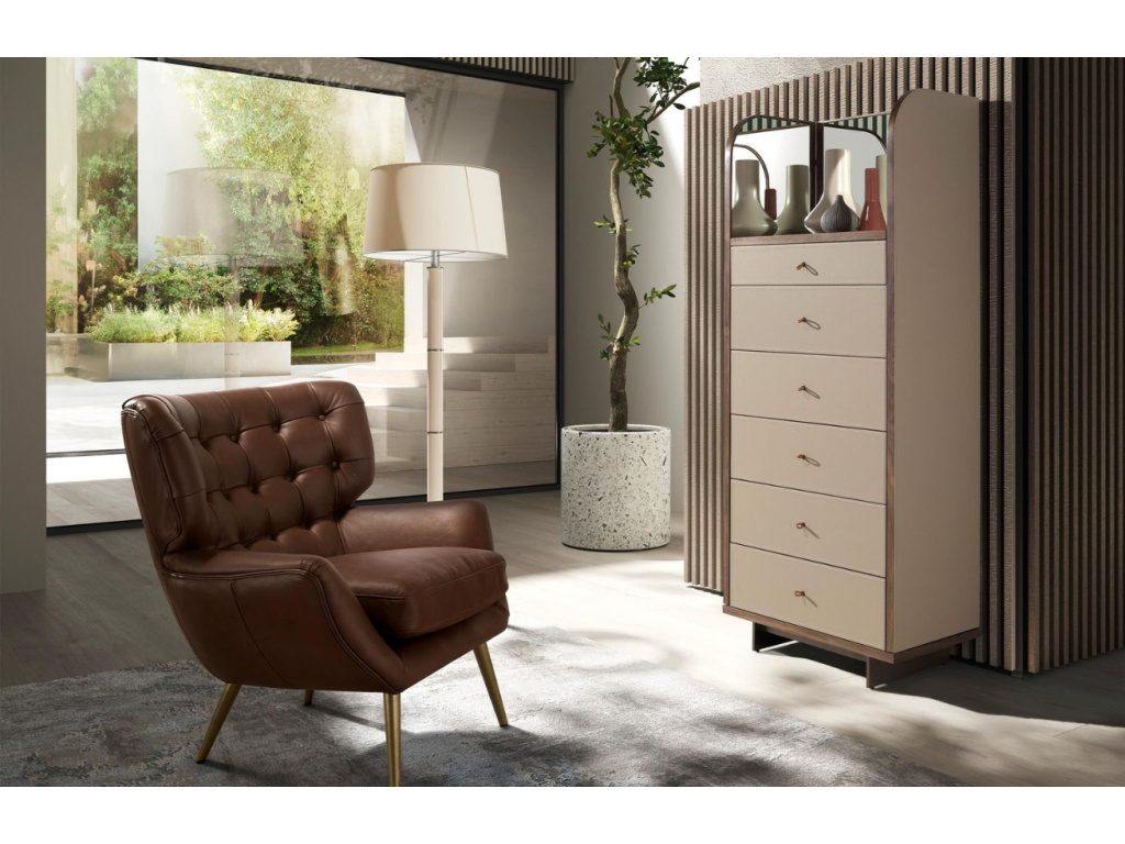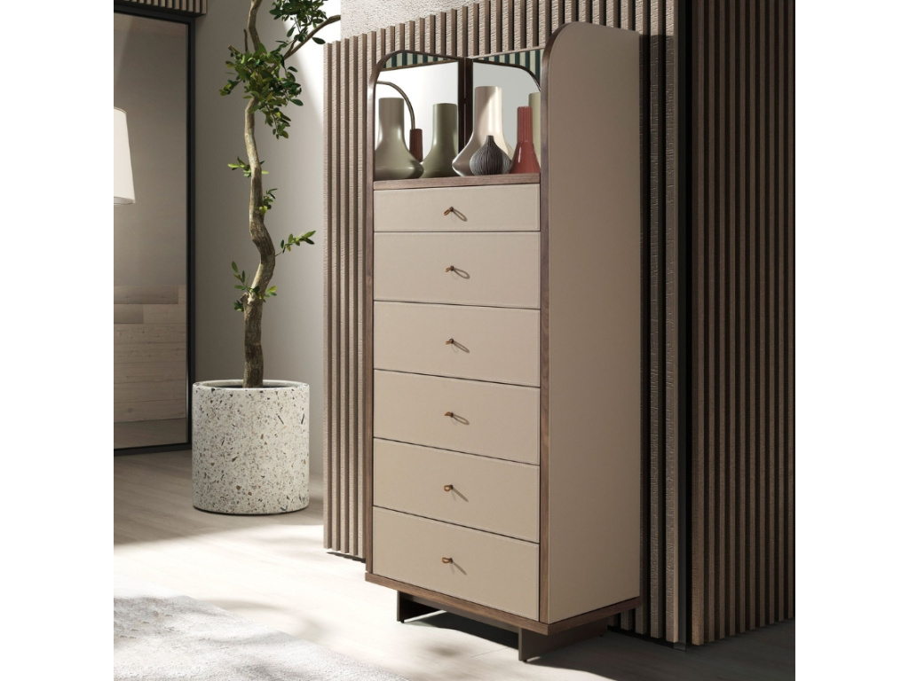 Vdechněte své ložnici moderní eleganci s prostornou komodou od španělské značky Angel Cerdá. Tento výrazný kousek kombinuje přírodní ořechovou dýhu s noblesním čalouněním z hovězí kůže v jemném norkovém odstínu. Jeho jemné linie podtrhuje leštěná ocelová podnož, která dodává celku vzdušnost i pevnost. Celkem 8 prostorných zásuvek s koženými poutky a tichým dovíráním skvěle využijete například v ložnici nebo v šatně. Je navíc vybavena třídílným zrcadlem, za kterým se ukrývá další úložný prostor – na jedno straně trojice polic, na druhé straně tří závěsné háčky. Zorganizovat vaše hodinky a šperky pomohou praktické přihrádky první zásuvky. Každý detail této komody působí precizně, promyšleně a mimořádně harmonicky – od barevného ladění až po kontrast materiálů. Doplnit ji můžete dalšími kousky ve stejném designu – nočním stolkem, dalšími komodami i věšáky s úložným prostorem.