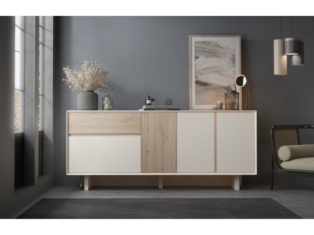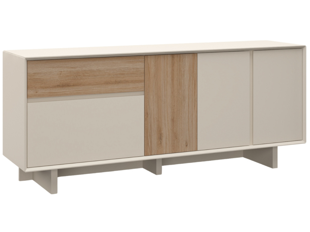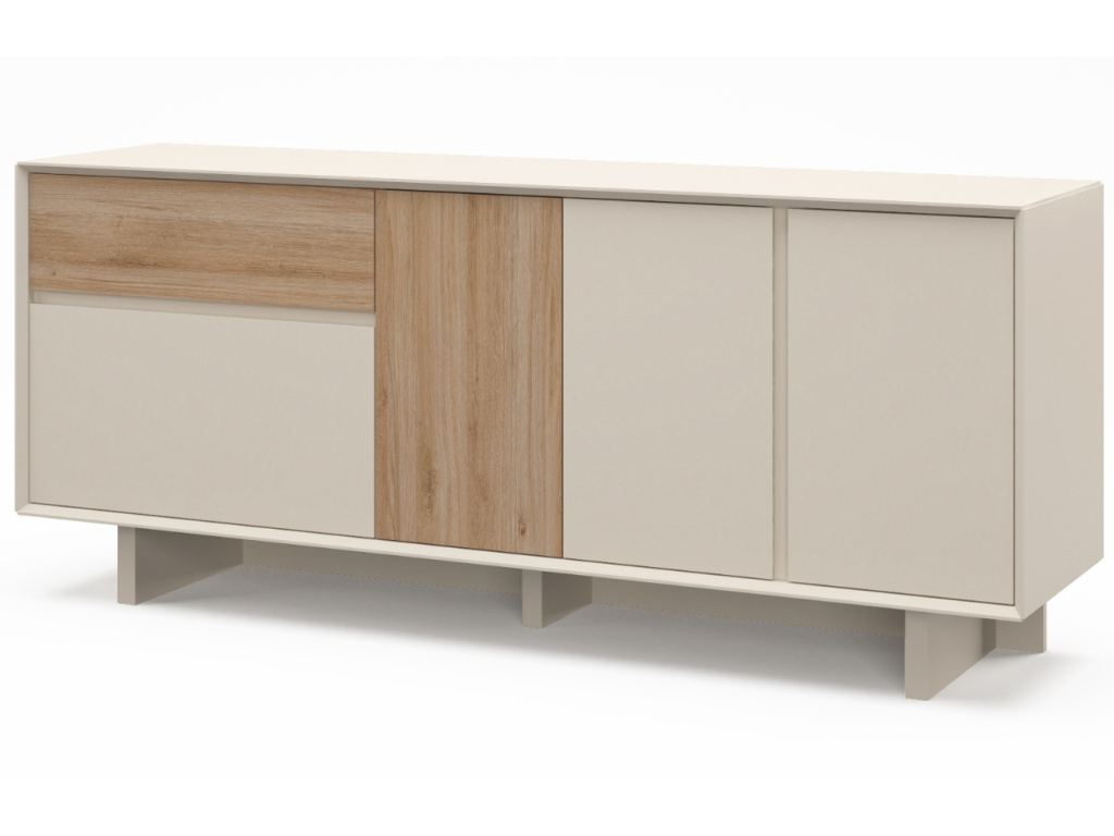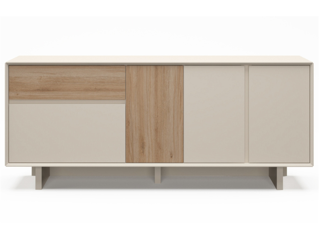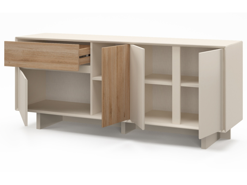 Komoda Carpi osloví každého, kdo dává přednost teplým přírodním tónům a nadčasovému designu. Kombinace lakovaného béžového povrchu s dubovým dekorem na zásuvce a prostředních dvířkách působí jemně a vkusně, ideální pro interiéry ve skandinávském nebo japandi stylu. Uvnitř najdete prakticky členěný úložný prostor s policemi i zásuvkou, který nabízí místo na všechno potřebné – od dokumentů po dekorace. Kolekce Carpi je dostupná ve dvou barevných variantách a zahrnuje dvě komody a TV stolek pro sladěné vybavení obývacího pokoje nebo ložnice.