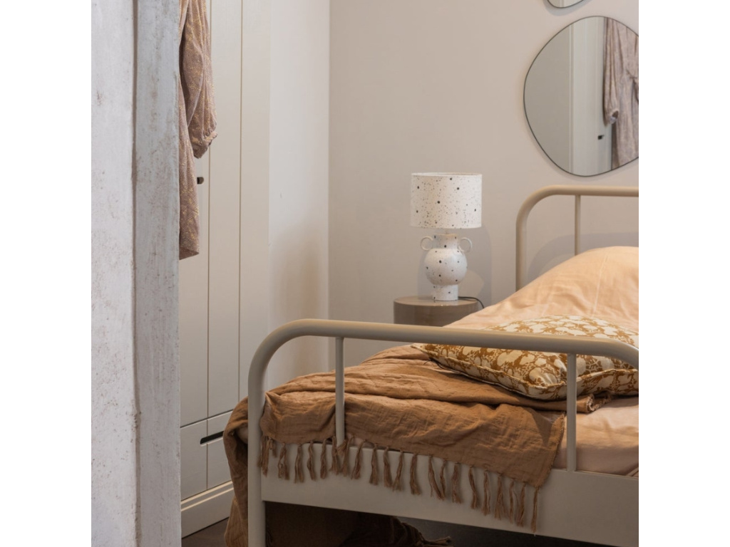 Jednolůžková postel Mata bude skutečným přínosem do každého dětského pokoje. Její rám je vyroben z pevného kovu, který je lakovaný béžovou barvou. Roštová základna je vyrobena také z kovu stejné barvy, a tak ustojí i ty nejdivočejší noci a hry dětí, které jsou plné energie. Nejenže se na postel budete moct plně spolehnou, ale její neotřelý styl dodá do dětského nebo studentského pokoje zajímavý designový prvek.
