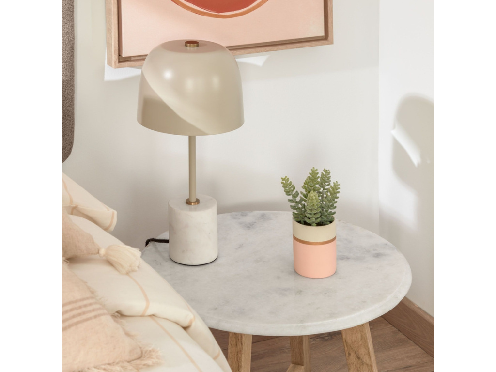 Nádherná a stylová stolní lampa Kave Home Alish vás zaujme svým elegantním vzhledem na první pohled. Podstava ve tvaru válce je vyrobená z bílého mramoru, který skvěle koresponduje s béžovým kovovým stínidlem. Zlatě lakované kovové detaily dodají lampě na atraktivnosti. Alish se hodí do moderních a světlých interiérů.
