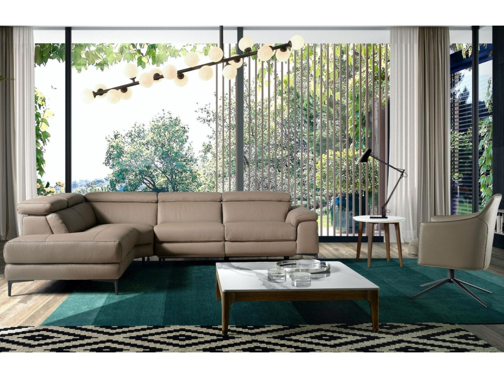 Tato rohová pohovka v sobě spojuje moderní eleganci a prvotřídní komfort. Čalounění z hovězí kůže v jemném tónu krásně zapadne do interiérů inspirovaných minimalistickým nebo glamour stylem. Rohová lenoška nabízí dostatek prostoru pro relaxaci i společné chvíle s rodinou. Elektrický relaxační systém umožní snadné nastavení ideální polohy pro maximální pohodlí. Kovová podnož v tmavém provedení dodává celé pohovce vizuální lehkost a stylový kontrast k jemné barvě čalounění.