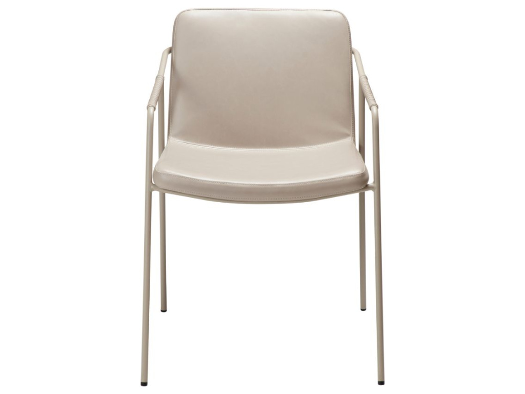 Béžová designová židle s područkami Boto je klasickou designovkou od Mortena Georgsena – designéra neodmyslitelně spjatého s dánskou značkou DAN-FORM. Boto rozhodně patří mezi židle, které nejlépe vyniknou v moderně laděných, minimalistických a čistě zařízených interiérech. Tvoří ji subtilní lakovaná kovová konstrukce a lehce tvarovaný, ekokůží čalouněný sedák. Zajímavým a velmi praktickým detailem přispívajícím k ještě většímu pohodlí jsou opletené části područek. Díky svému vytříbenému a poměrně střídmému designu se židle Boto nestane hlavní hvězdou ani dominantou prostoru, ale spíše nenápadným a spolehlivě komfortním společníkem, který stylově podpoří celkovou atmosféru.