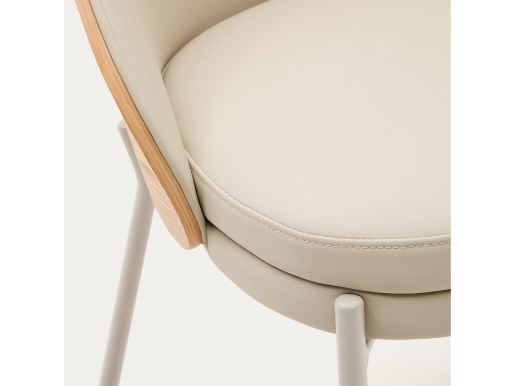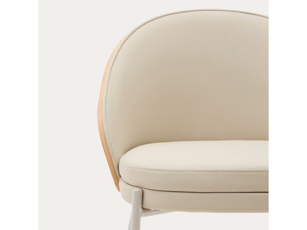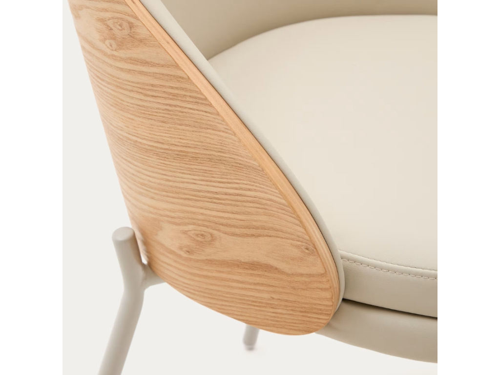 Židle Kave Home Eamy zaujme svým prostorným opěradlem, vyrobeným z jasanové dýhy s krásnou výraznou kresbou. Vkusně jej doplňuje čalounění z ekokůže béžové barvy a štíhlá kovová podnož. Eamy bude u jídelního stolu nejen pohodlným místem k sezením, ale také designovým kouskem, který dodá celé místnosti styl. Umístit ji ale můžete také do pracovny nebo do studentského pokoje – bude skvělým parťákem při práci i učení!