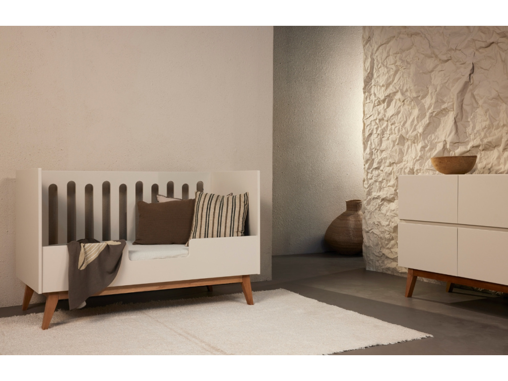 Ozdobou každého dětského pokojíčku bude postýlka Quax Trendy. Značka Quax přichází s řadou Trendy v béžové barvě, která zaujme na první pohled svým minimalistickým a čistým designem. Konstrukce je vyrobena z odolné lakované MDF, stabilitu zajistí masivní buková podnož. Postýlku lze nastavit ve třech úrovních výšky, díky čemuž postýlku přizpůsobíte přesně dle vašich potřeb nebo je možné zcela odmontovat bočnici a zajistit tak útulné místečko i pro větší děti. Doporučujeme kombinaci více prvků z řady Trendy, abyste vytvořili dokonalou souhru v interiéru.