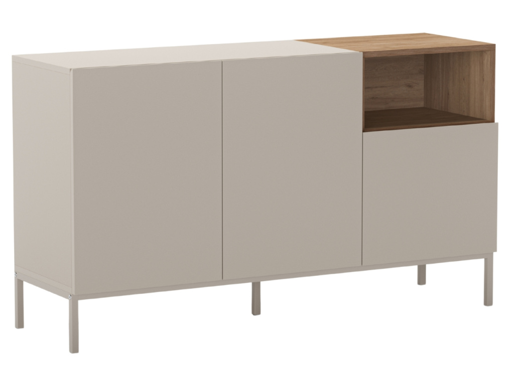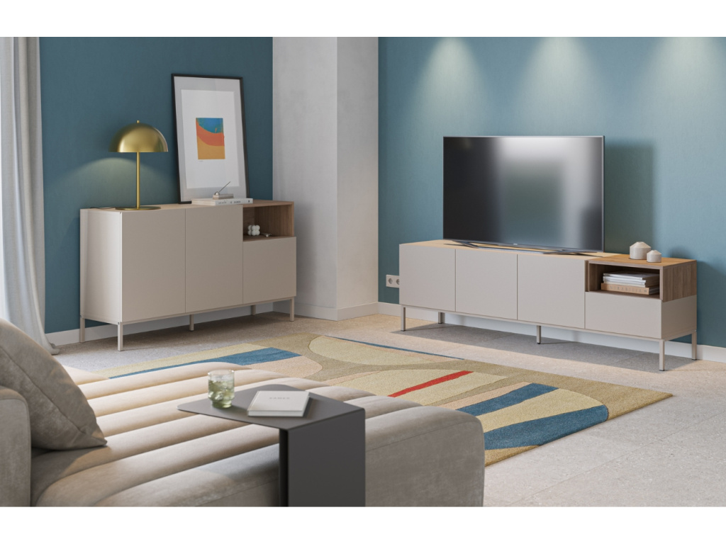 Komoda Cailin v krémové barvě s přírodním dekorem dřeva zaujme minimalistickým vzhledem a praktickým zpracováním. Korpus je vyroben z kvalitních MDF desek a subtilní podnož je z lakovaného kovu. Zkosené hrany dvířek nahrazují úchytky a vytváří elegantní detail. Uvnitř komody se nachází dostatek úložného místa pro vše potřebné. Hodí se do skandinávských, minimalistických i přírodně laděných interiérů. Tato kolekce zahrnuje také konferenční stolek, tři varianty komod a dva velikostní typy TV stolků. K dostání je rovněž ve variantě s dřevěným dekorem.