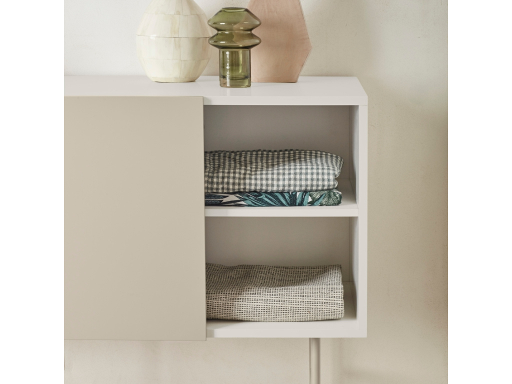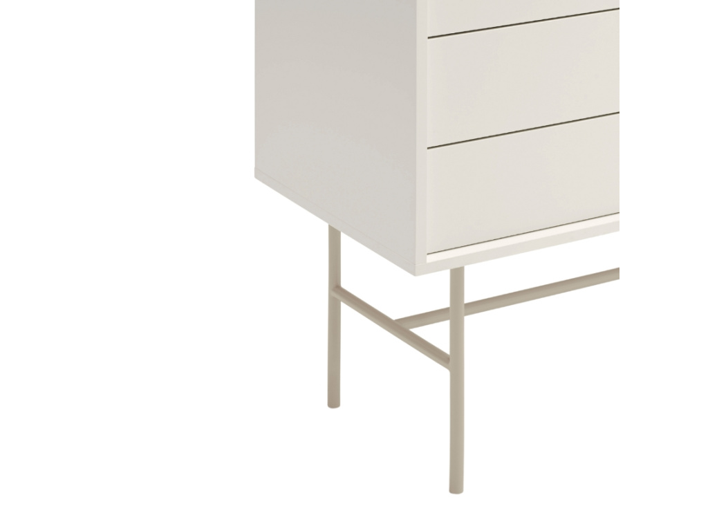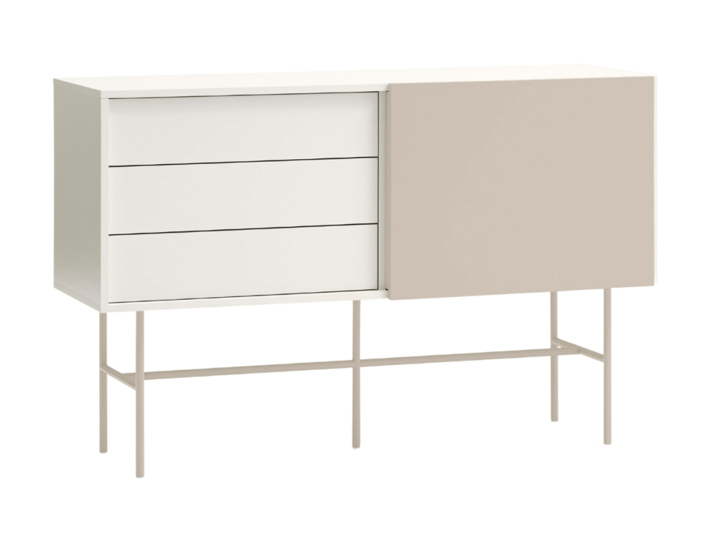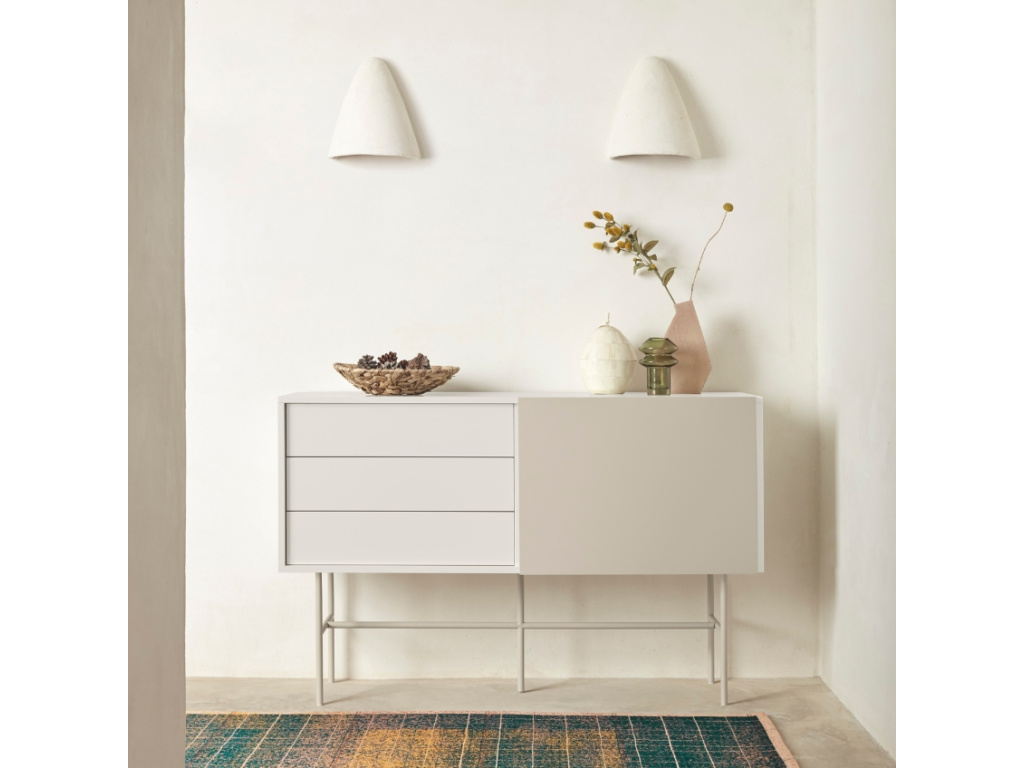 Minimalistická komoda Nube od španělské značky Teulat vás oslní elegantním designem i praktickým uspořádáním věcí. Designová komoda v béžové a krémové barvě se skládá ze 3 šuplíků a 2 prostorných polic, které můžete zakrýt posuvnými dveřmi. Ať už se tak rozhodnete využít úložný prostor na cokoliv, můžete se spolehnout na diskrétní ukrytí vašich pokladů před zraky ostatních. Díky bezúchytkovému provedení vyniknou jednoduché a čisté linie komody. Praktický systém Push to open zase zajistí, že zásuvky a dvířka snadno otevřete i bez úchytek. Použité lakované MDF vás jistě potěší snadnou údržbou a vysokou odolností. Nelze opomenout ani béžovou kovovou podnož, díky které budete mít věci hezky po ruce bez zbytečného ohýbání. Komodu nabízíme ve třech barevných provedeních.