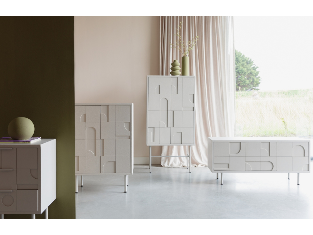 Komoda FUNK v béžové barvě se stane jedinečným designovým prvkem, který zaujme každého, kdo do interiéru vkročí. Komoda z MDF materiálu s podnoží z lakovaného kovu se hodí především do moderních, ale i například do vintage interiérů. Komoda disponuje praktickými třemi zásuvkami a poslouží vám k odložení rozečtené knihy, šálku s kávou nebo na ni můžete vystavit vázu s květinami. FUNK je výrazný a originální kus nábytku, který můžete umístit například do předsíně, obývacího pokoje nebo ložnice.