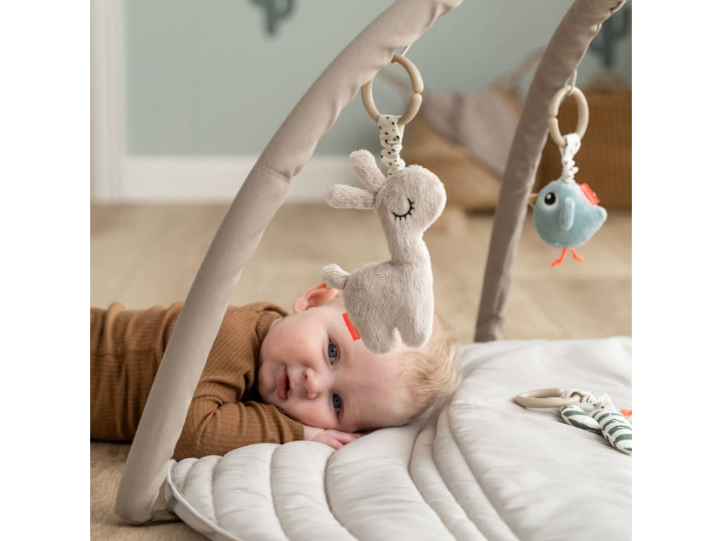 Hrací podložka s hrazdičkou Lalee od Done by Deer bude rozvíjet dětskou fantazii a dovednosti. Oblouková hrazdička obsahuje čtyři závěsné hračky, které rozvíjejí motorické schopnosti dětí, a lze je umístit do třinácti různých pozic. Lama Lalee a kaktus praskají při dotyku, ptáček Birdee chrastí, zasněžená hora obsahuje zvoneček a zrcátko, kde může vaše miminko pozorovat svojí tvářičku. Měkká útulná dečka poskytne miminku pohodlí, a navíc se dá oddělit od hrazdičky, a využít jako samostatný prvek. Hračky můžete díky praktickému uchycení samostatně zavěsit například na dětský kočárek nebo autosedačku.